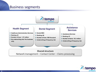 Tempo reported strong financial results in 2Q08, with net revenue increasing 27% to R$169 million and EBITDA growing 87% to R$18.9 million. The health segment saw revenue growth of 37% and a 15.5% EBITDA margin. The dental segment, including recent acquisitions, grew revenue 202% with a 24.7% EBITDA margin. The assistance segment grew revenue 13% with an 11.7% EBITDA margin. Tempo continues to grow organically and through acquisitions while maintaining asset-light operations.