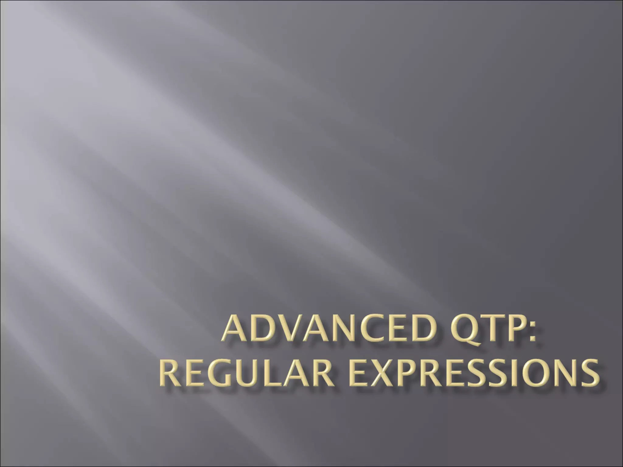 This document discusses regular expressions and their use in QuickTest. Regular expressions allow QuickTest to match text and object properties that may vary between test runs. They can be used to define object properties, parameterize steps, and create checkpoints for varying values. Key points covered include regular expression syntax like wildcards, character sets, and quantifiers; and how to set the RegularExpression property to treat a property value as a regular expression rather than a literal string.