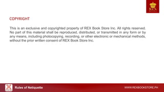 This document provides information about rules of netiquette from the REX Book Store, including:
