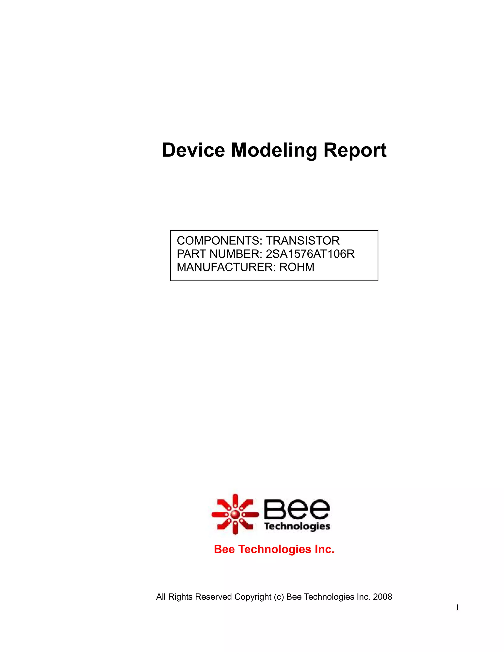 The document is a detailed device modeling report for the transistor part number 2SA1576AT106R by Rohm Bee Technologies Inc. It includes specifications such as current, voltage, resistance parameters, and various characteristic curves derived from circuit simulations. The report also presents comparison graphs between measurement and simulation results for forward and reverse characteristics.