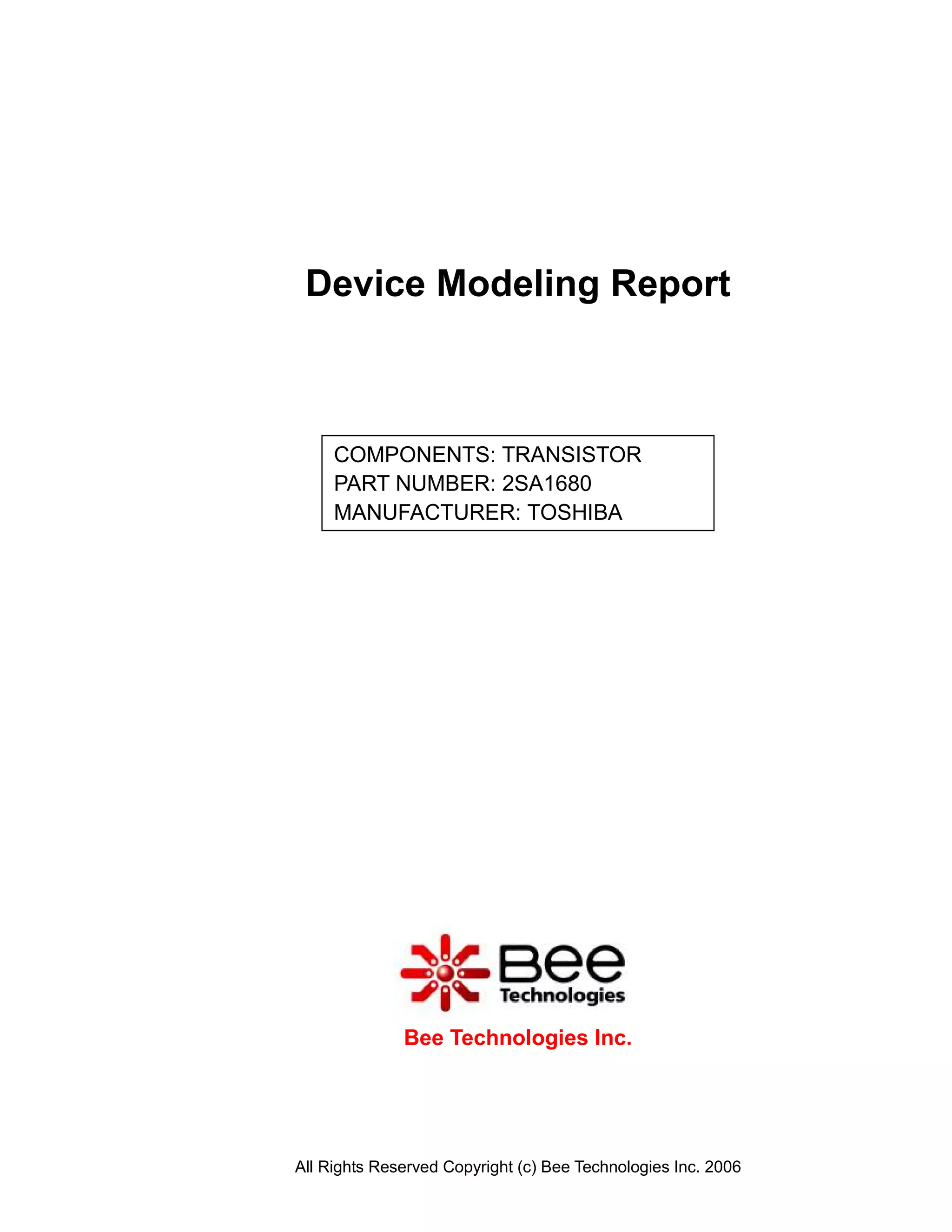 This document summarizes the modeling of the 2SA1680 transistor from Toshiba. It includes the PSpice model parameters and their descriptions. Graphs show simulations of characteristics like reverse/forward early voltage, DC beta, capacitance, hFE vs IC, VCE saturation, VBE saturation, and switching/output characteristics. The simulations closely match experimental measurements, validating the accuracy of the transistor model.