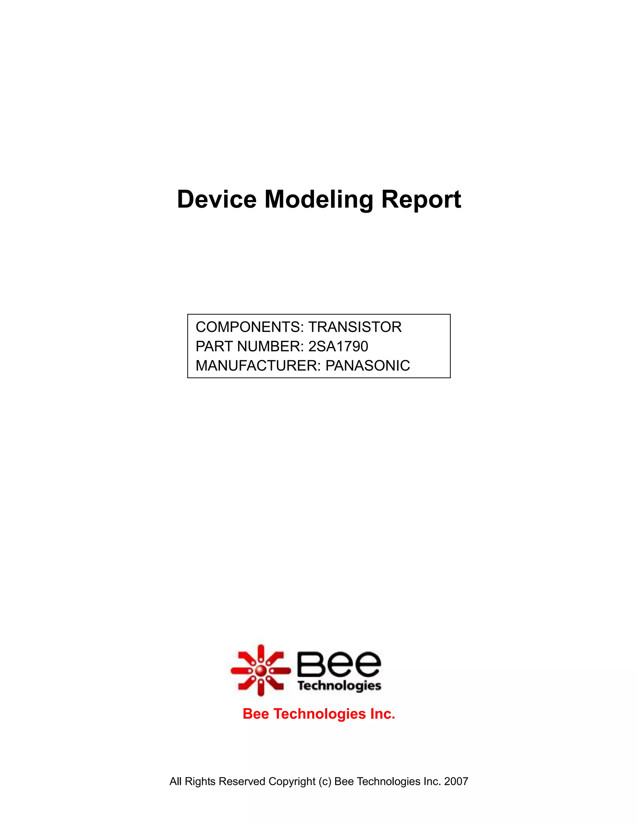 The document is a device modeling report for the transistor part number 2SA1790, manufactured by Panasonic Bee Technologies Inc. It includes detailed specifications and simulation results regarding various characteristics such as saturation current, forward and reverse beta, capacitance characteristics, and measurements compared to simulations. The report also contains circuit evaluation data and graphs illustrating the relationship between current and voltage under different operational conditions.