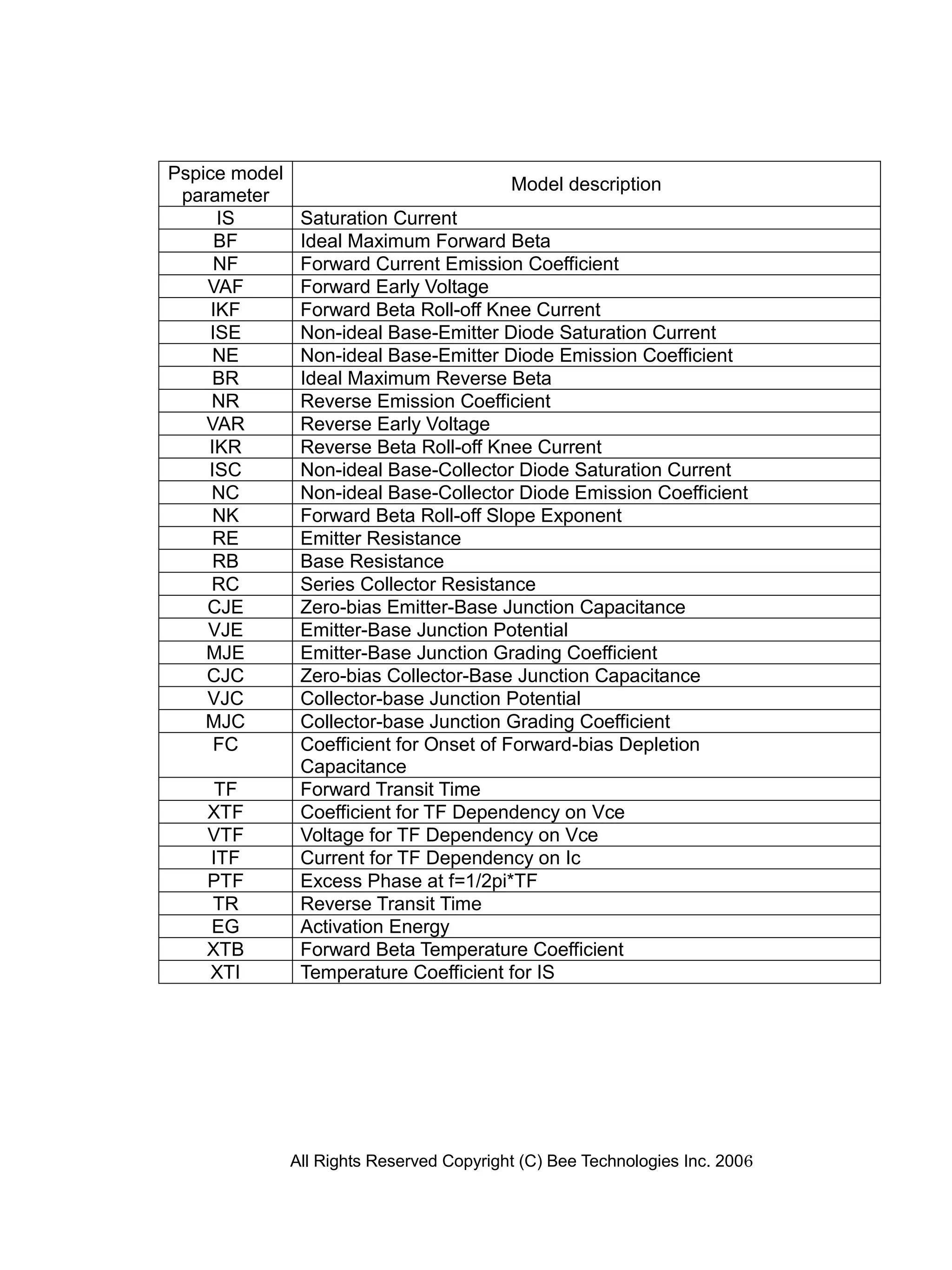 The document is a device modeling report for a bipolar junction transistor (2SA2004) from Panasonic, detailing its PSPICE model and various electrical characteristics. It includes parameters like saturation current, forward and reverse beta, and forward transit time, along with results from circuit simulations and comparisons between measurements and simulations. All content is copyrighted by Bee Technologies Inc. in 2006.