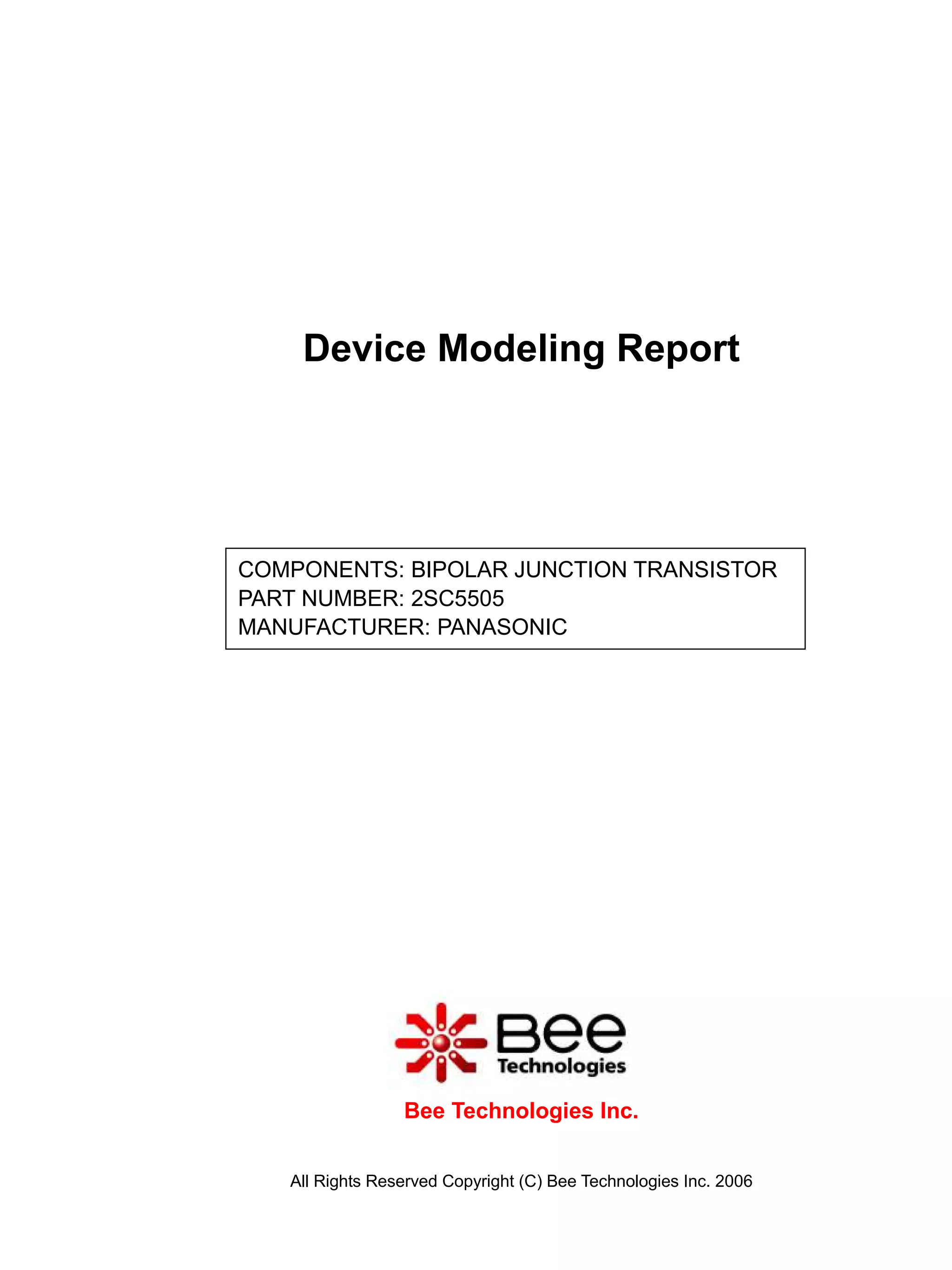 The document is a device modeling report for a bipolar junction transistor (BJT), specifically the part number 2SC5505 from Panasonic Bee Technologies Inc. It includes detailed information on the transistor's parameters, characteristics, and circuit simulation results related to statistics such as saturation current, forward and reverse beta, capacitance, and switching dynamics. The report covers several characteristics measurements and simulations, providing insights into performance and reliability metrics for the BJT.