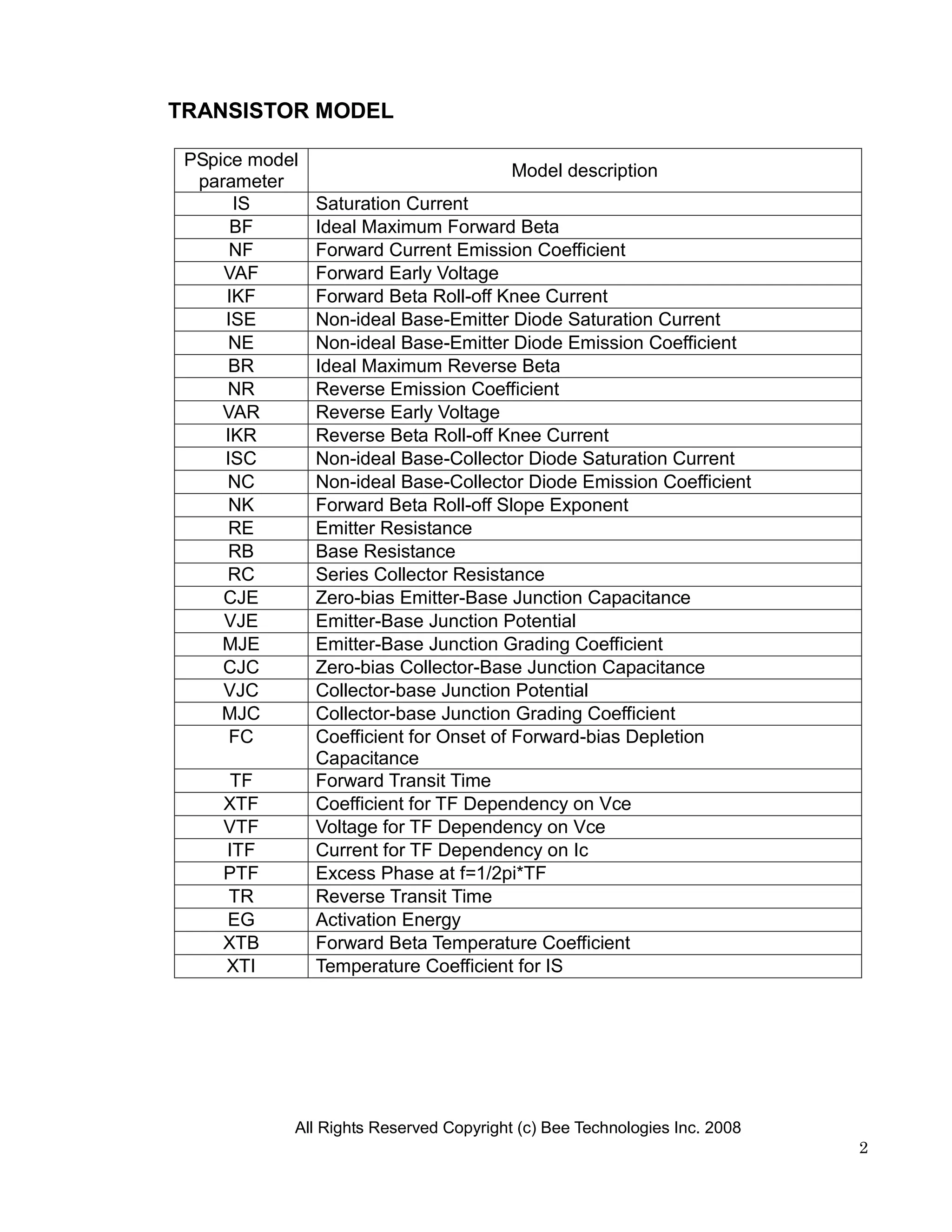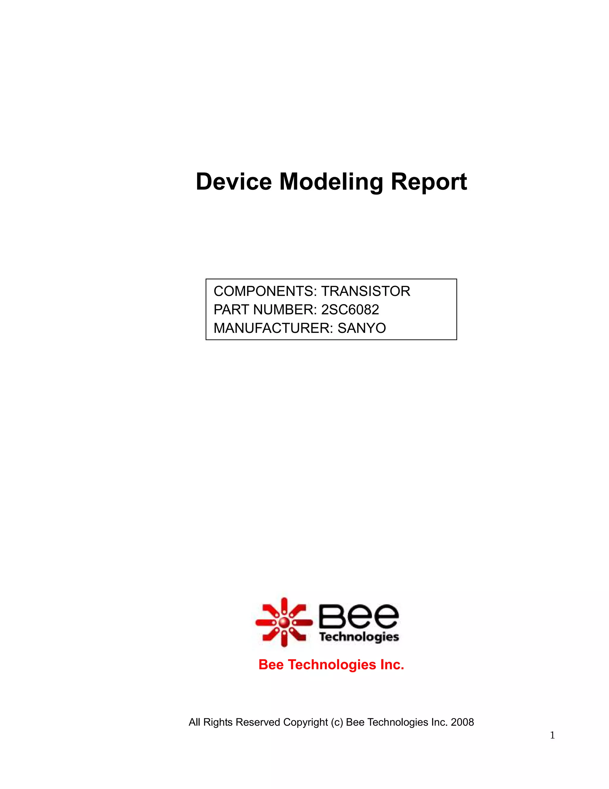 The document provides a detailed device modeling report for the transistor model 2SC6082 manufactured by Sanyo Bee Technologies Inc. It includes parameters for both forward and reverse characteristics, including current and voltage metrics, as well as simulation results and error analyses for various performance metrics. The report emphasizes characteristics such as saturation current, beta values, and capacitance measurements, validated through circuit simulation results.
