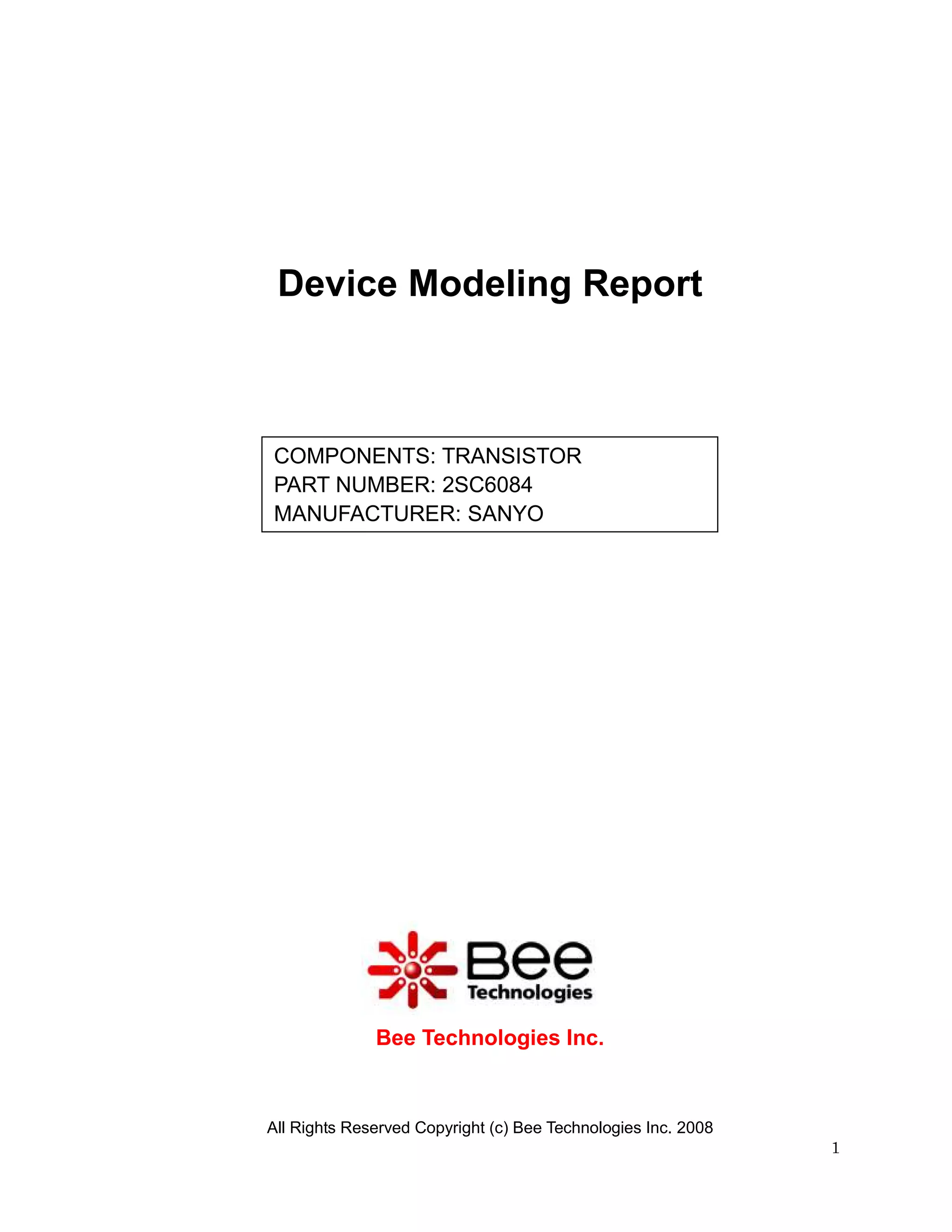 The document provides a detailed overview of the transistor model 2SC6084 by Sanyo, including its electrical parameters and characteristics relevant for device modeling. It features simulation results for various metrics such as current gain (hFE), saturation values, capacitance, and switching characteristics, with accompanying graphical comparisons to experimental data. Additionally, it contains extensive technical data for circuit evaluation and performance assessments of the transistor.