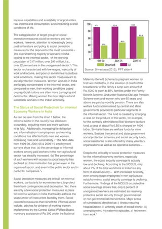 This document discusses social protection schemes for informal workers in India. It notes that most Indian workers are in the informal sector, which lacks protections like healthcare, pensions, etc. It analyzes current social programs and finds they have low coverage and accessibility issues. Recommendations include using technology like Aadhaar unique IDs and health insurance programs to simplify delivery. Challenges remain in addressing the needs of vulnerable groups like women, migrants, and ensuring converged rather than separate welfare schemes.
