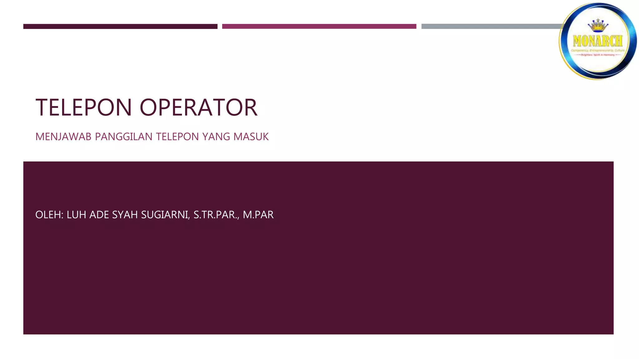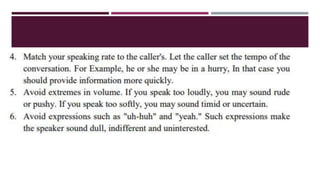 The document provides guidance for telephone operators on how to properly handle incoming calls at a hotel. It outlines the goals of training which include demonstrating polite telephone etiquette, taking accurate messages, handling complaints courteously, and promoting hotel services. The duties of telephone operators are described as answering calls, directing them to rooms or departments, and processing wake-up calls. Operators are advised to speak clearly and listen attentively to make a good impression. Proper call handling procedures and standard phrases for different call situations are also presented.