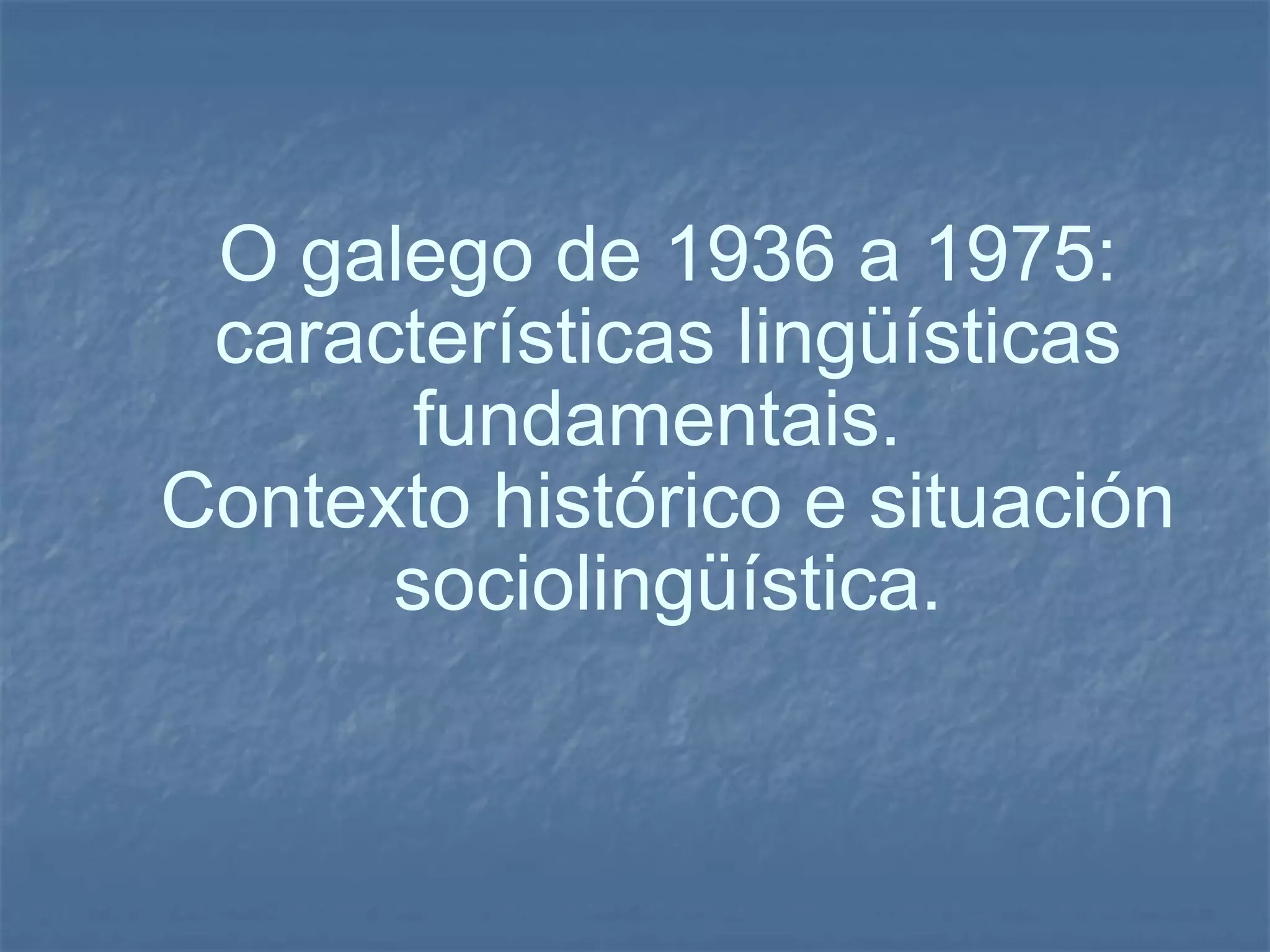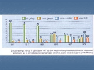 Nos corenta anosde franquismo, o proceso de desgaleguización idiomática experimentou unha aceleración sen precedentes: produciuse un considerábel incremento do uso do castelán entre a poboación de núcleos urbanos e vilegos. houbo unha importante penetración do castelán no mundo rural, ata entón monolingüe en galego. rexistrouse un significativo aumento da falantes monolingües en castelán. espalláronse intensamente os prexuízos e os comportamentos diglósicos no seo da sociedade.