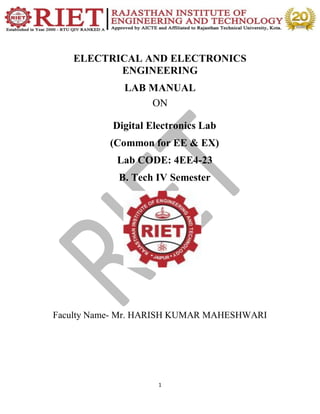 This document provides information about a digital electronics lab manual. It outlines 10 experiments to be performed, including verifying the truth tables of basic logic gates like AND, OR, NAND, and NOR gates. It also describes experiments with half adders, full adders, multiplexers, decoders, flip-flops, and counters. The document provides background information on breadboards and building circuits. It explains the functionality of logic gates like AND, OR, NOT, NAND and NOR gates.