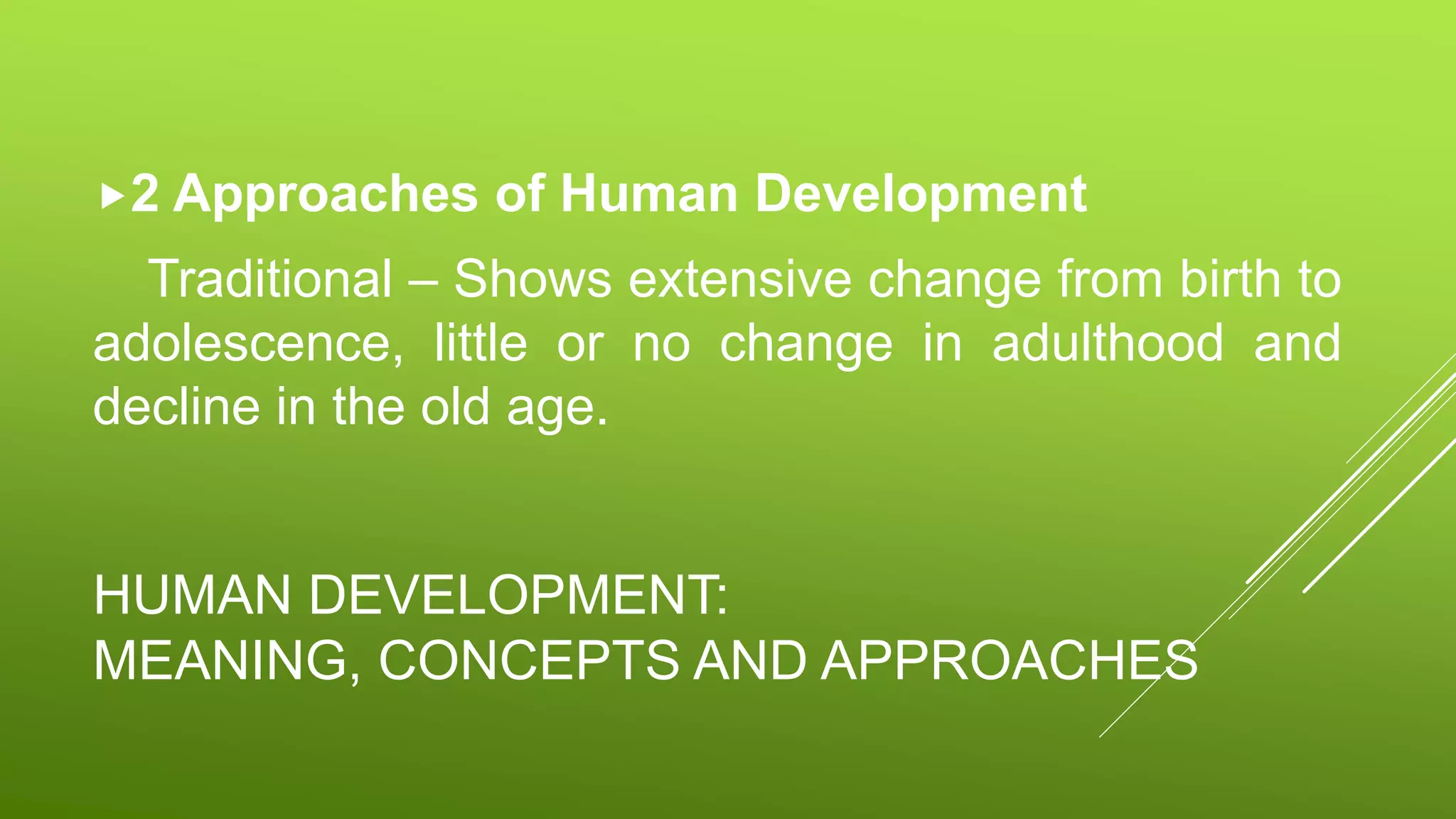 The document discusses two approaches to human development - the traditional approach and lifespan approach. The lifespan approach views development as occurring throughout the entire lifespan from childhood to adulthood, rather than stopping after adolescence. It also describes five key characteristics of lifespan development: it is lifelong, plastic, multidimensional, contextual, and involves growth, maintenance, and regulation. The stages of development span from prenatal to late adulthood. Research methods in child and adolescent development include case studies, observational studies, experiments, and longitudinal studies. Ethical principles require research to not harm children and respect their privacy. Research impacts teachers by making them more reflective, analytical, and able to reconstruct their profession.