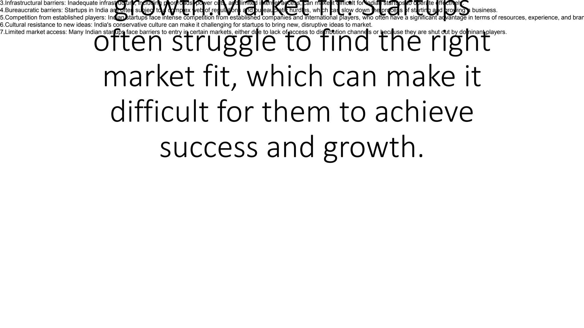 Indian startups face several challenges to achieving success and growth including finding the right market fit, inadequate infrastructure, complex regulations and bureaucratic hurdles, intense competition from larger established companies, cultural resistance to new ideas, and limited access to certain markets due to lack of distribution channels or dominance by larger players.