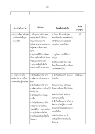 ปลูกฝังคุณธรรม จริยธรรม โดยยึดกระบวนการลูกเสือนําเยาวชนสู่ จิตสาธารณะ บนพื้นฐานความเป็นไทยดูแลช่วยเหลือนักเรียนภายใต้ หลักปรัชญาของเศรษฐกิจพอเพียง โครงการ/กิจกรรม เป้าหมาย ตัวบ่งชี้ความสําเร็จ สนอง มาตรฐาน 1.โครงการบูรณาการ 1.ร้อยละของนักเรียนที่สามารถ 1.ร้อยละ 95 ของผู้เรียน 2,614,15 4.นักเรียนชั้น ป4 –ป.6ร้อยละ ไม่ต่ํากว่า 50 มีรายได้ระหว่าง เรียน 5.ส่งเสริมความเป็นเลิศ 4.ร้อยละ 50 ของนักเรียนชั้น ป.4 – ป.6 มีรายได้ระหว่าง เรียน 5.นักเรียนที่มีความเป็นเลิศ ได้รับการส่งเสริมเป็นตัวแทน แข่งขันในระดับต่างๆ 12.โครงการยกระดับ ผลสัมฤทธิ์ทางการเรียน สาระการเรียนรู้ ภาษาต่างประเทศ 1.นักเรียนร้อยละ 80 มีทักษะ ในการฟัง พูด อ่าน และเขียน ภาษาอังกฤษ 2.นักเรียนร้อยละ 80 มีเจตคติ ที่ดีต่อวิชาภาษาอังกฤษ 3.นักเรียนร้อยละ 80 รู้จัก ความหมายและนําคําศัพท์ไป ใช้ภาษาอังกฤษในสถานการณ์ ต่างๆ 1.ร้อยละ 90 ของนักเรียน มี ทักษะในการฟัง พูด อ่าน และ เขียน 2.ร้อยละ 90 ของนักเรียนมี ความพึงพอใจต่อการเรียน ภาษาอังกฤษ 3.ร้อยละ 80 รู้จักความหมาย และนําคําศัพท์ภาษาอังกฤษไปใช้ ในสถานการณ์ต่างๆได้ 10,11,12,13 โครงการ/กิจกรรม เป้าหมาย ตัวบ่งชี้ความสําเร็จ สนอง มาตรฐาน 13.โครงการพัฒนา กระบวนการคิดสู่ ห้องเรียน 1.ร้อยละ 100 ของนักเรียน ได้รับการพัฒนาให้มีทักษะ กระบวนการคิดแบบต่างๆ 1. ร้อยละ 100 ของนักเรียน ได้รับการพัฒนาให้มีทักษะ กระบวนการคิดแบบต่างๆ 3,4,5