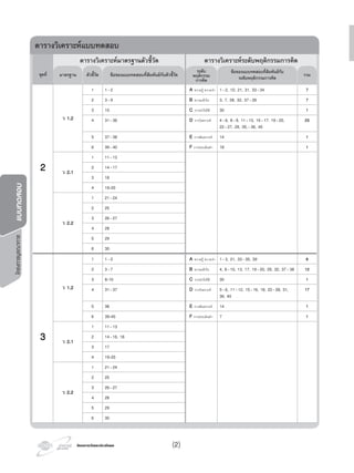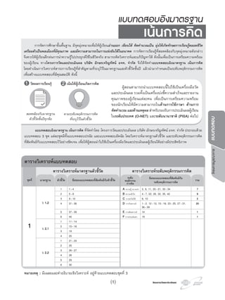 …………………………………………………………………………………………….. เลขประจําตัวสอบ ……………………………………………………………………. โรงเรียน ……………………………………………………………………………………………. สอบวันที่ …………………….. เดือน ………………………………………………… พ.ศ. ……………………………………….. โครงการวัดและประเมินผล บริษัท อักษรเจริญทัศน อจท. จํากัด 4. ขอใดไมใชลักษณะทางพันธุกรรม 1. สีผิว 2. ลักยิ้ม 3. ชั้นตา 4. แผลเปน 5. กําหนดให A แทน ยีนเดนที่ควบคุมลักษณะผิวปกติ a แทน ยีนดอยที่ควบคุมลักษณะผิวเผือก สามี-ภรรยาที่มีลักษณะยีนในคูใดที่ลูกของพวกเขา มีโอกาสแสดงลักษณะผิวเผือกรอยละ 50 1. AA × aa 2. Aa × Aa 3. Aa × aa 4. AA × Aa 6. ลักยิ้มเปนลักษณะทางพันธุกรรมที่มียีนอยูบนออโตโซม หากชายคนหนึ่งมีลักยิ้ม ซึ่งมียีนแบบ Aa แตงงานกับ หญิงคนหนึ่งที่ไมมีลักยิ้ม ซึ่งมียีนแบบ aa ลูกแตละคนจะ มีโอกาสมีลักยิ้มรอยละเทาใด 1. 25 2. 50 3. 75 4. 100 4.4. ขอใดไมใชลักษณะทางพันธุกรรม 1. สีผิวB 5. a แทน ยีนดอยที่ควบคุมลักษณะผิวเผือก 5. กําหนดให A แทน ยีนเดนที่ควบคุมลักษณะผิวปกติ a แทน ยีนดอยที่ควบคุมลักษณะผิวเผือกa แทน ยีนดอยที่ควบคุมลักษณะผิวเผือกD a แทน ยีนดอยที่ควบคุมลักษณะผิวเผือก 6.6. ลักยิ้มเปนลักษณะทางพันธุกรรมที่มียีนอยูบนออโตโซม หากชายคนหนึ่งมีลักยิ้ม ซึ่งมียีนแบบ Aa แตงงานกับD อานขอความที่กําหนดให แลวตอบคําถามขอ 1. “เซลลเปนหนวยพื้นฐานของสิ่งมีชีวิตที่มีขนาดเล็ก ที่สุด ภายในเซลลมีนิวเคลียส ในนิวเคลียสมีเสนใยเล็กๆ พันกันอยู เรียกเสนใยเหลานี้วา โครมาทิน ซึ่งเมื่อมีการ แบงเซลล เสนใยโครมาทินจะหดตัวสั้นจนมีลักษณะเปน แทง เรียกวา โครโมโซม” 1. ขณะที่มีการแบงเซลล โครโมโซมจะมีลักษณะอยางไร 1. มีลักษณะเปนแทง 2. ขดไปมาอยูในนิวเคลียส 3. จับกันเปนคูๆ ชัดเจน 23 คู 4. ไมปรากฏโครโมโซมใหเห็น 2. โครโมโซมของมนุษยเปนไปตามขอใด 1. เปนออโตโซม 46 คู และเปนโครโมโซมเพศ 1 คู 2. เปนออโตโซม 45 คู และเปนโครโมโซมเพศ 1 คู 3. เปนออโตโซม 23 คู และเปนโครโมโซมเพศ 1 คู 4. เปนออโตโซม 22 คู และเปนโครโมโซมเพศ 1 คู 3. การถายทอดลักษณะของสิ่งมีชีวิตจากรุนหนึ่งไปสูอีก รุนหนึ่ง เปนความหมายของคําในขอใด 1. พันธุกรรม 2. พันธุศาสตร 3. พันธุวิศวกรรม 4. โรคทางพันธุกรรม 1.1. ขณะที่มีการแบงเซลล โครโมโซมจะมีลักษณะอยางไร 1. มีลักษณะเปนแทงA 2.2. โครโมโซมของมนุษยเปนไปตามขอใด 1. เปนออโตโซม 46 คู และเปนโครโมโซมเพศ 1 คูA 3.3. การถายทอดลักษณะของสิ่งมีชีวิตจากรุนหนึ่งไปสูอีก รุนหนึ่ง เปนความหมายของคําในขอใดA ¤Ðá¹¹·Õèä´Œ ¤Ðá¹¹àµçÁ 40 ตอนที่ 1 แบบปรนัย 4 ตัวเลือก แตละขอมีคําตอบที่ถูกตองที่สุดเพียงคําตอบเดียว จํานวน 40 ขอ ขอละ 1 คะแนน ความรู ความจํา ความเขาใจ การนําไปใช การวิเคราะห การสังเคราะห การประเมินค