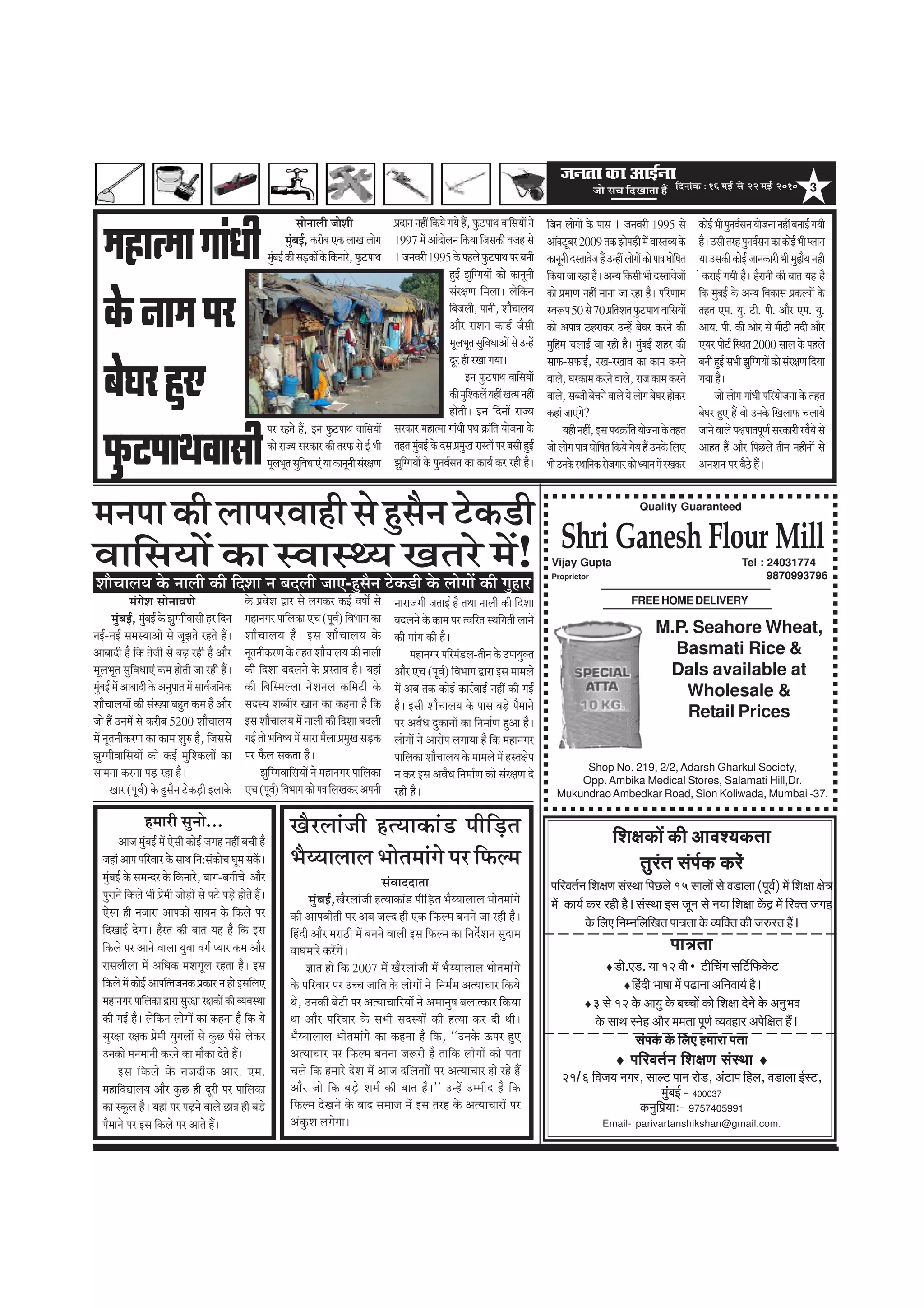 me®e efoKeelee nQ efoveebkeÀ ë 16 ceF& mess 22 ceF& 2010 3 efMe#ekeÀeW keÀer DeeJeM³ekeÀlee legjble mebHe&keÀ keÀjbs HeefjJele&ve efMe#eCe mebmLee efHeíues 15 meeueeW mes Je[euee (HetJe&) ceW efMe#ee #es$e ceW keÀe³e& keÀj jner nw~ mebmLee Fme petve mes ve³ee efMe#ee keWÀê ceW efjkeÌle peien kesÀ efueS efvecveefueefKele Hee$elee kesÀ J³eefkeÌle keÀer pe©jle nQ~ Hee$elee ♦[er.S[. ³ee 12 Jeer •ìeref®bbebie meefì&efHeÀkesÀì ♦efnboer Yee<ee ceW He{evee DeefveJee³e& nw~ ♦3 mes 12 kesÀ Dee³eg kesÀ ye®®eeW keÀes efMe#ee osves kesÀ DevegYeJe kesÀ meeLe mvesn Deewj cecelee HetCe& J³eJenej DeHesef#ele nQ~ mebHeke&À kesÀ efueS nceeje Helee ♦ HeefjJele&ve efMe#eCe mebmLee ♦ 21/6 efJepe³e veiej, meeuì Heeve jes[, DebìeHe efnue, Je[euee F&mì, cegbyeF& - 400037 keÀvegefHe´³eeë- 9757405991 Email- parivartanshikshan@gmail.com. Quality Guaranteed Shop No. 219, 2/2, Adarsh Gharkul Society, Opp. Ambika Medical Stores, Salamati Hill,Dr. MukundraoAmbedkar Road, Sion Koliwada, Mumbai -37. Shri Ganesh Flour Mill Vijay Gupta Tel : 24031774 Proprietor 9870993796 FREE HOME DELIVERY M.P. Seahore Wheat, Basmati Rice & Dals available at Wholesale & Retail Prices ½ãÖ㦽ããØããâ£ããè ‡ãñжãã½ã¹ãÀ ºãñÜãÀÖì† ¹ã슛¹ãã©ãÌããÔããè Ôããñ¶ããÊããè •ããñÍããè ½ãìâºãƒÃ,‡ãŠÀãèºã†‡ãŠÊããŒãÊããñØã ½ãìâºãƒÃ‡ãŠãèÔãü¡‡ãŠãò‡ãñŠãä‡ãжããÀñ,¹ã슛¹ãã©ã ¹ãÀ ÀÖ¦ãñ Öö, ƒ¶ã ¹ã슛¹ãã©ã ÌãããäÔã¾ããò ‡ãŠãñ À㕾ã ÔãÀ‡ãŠãÀ ‡ãŠãè ¦ãÀ¹ãŠ Ôãñ ƒÃ ¼ããè ½ãîÊã¼ãî¦ãÔãìãäÌã£ãã†â¾ãã‡ãŠã¶ãî¶ããèÔãâÀàã¥ã ¹ãƪã¶ã¶ãÖãéãä‡ãоãñØã¾ãñÖö,¹ã슛¹ãã©ãÌãããäÔã¾ããò¶ãñ 1997½ãò‚ããâªãñÊã¶ããä‡ãоãããä•ãÔã‡ãŠãèÌã•ãÖÔãñ 1•ã¶ãÌãÀãè1995‡ãñйãÖÊãñ¹ã슛¹ãã©ã¹ãÀºã¶ããè ÔãÀ‡ãŠãÀ ½ãÖ㦽ãã Øããâ£ããè ¹ã©ã ‰ãŠãâãä¦ã ¾ããñ•ã¶ãã ‡ãñŠ ¦ãÖ¦ã½ãìâºãƒÃ‡ãñŠªÔã¹ãƽãìŒãÀãÔ¦ããò¹ãÀºãÔããèÖìƒÃ ¢ãìã䨨ã¾ããò ‡ãñŠ ¹ãì¶ãÌãÃÔã¶ã ‡ãŠã ‡ãŠã¾ãà ‡ãŠÀ ÀÖãè Öõý ãä•ã¶ã ÊããñØããò ‡ãñŠ ¹ããÔã 1 •ã¶ãÌãÀãè 1995 Ôãñ ‚ããù‡ã‹›îºãÀ2009¦ã‡ãŠ¢ããñ¹ãü¡ãè½ãòÌããÔ¦ã̾ã‡ãñŠ ‡ãŠã¶ãî¶ããèªÔ¦ããÌãñ•ãÖö„¶ÖãéÊããñØããò‡ãŠãñ¹ãã¨ãÜããñãäÓã¦ã ãä‡ãоãã•ããÀÖãÖõý‚ã¶¾ããä‡ãŠÔããè¼ããèªÔ¦ããÌãñ•ããò ‡ãŠãñ ¹ãƽãã¥ã ¶ãÖãé ½ãã¶ãã •ãã ÀÖã Öõý ¹ããäÀ¥ãã½ã ÔÌã¹ã50Ôãñ70¹ãÆãä¦ãÍã¦ã¹ã슛¹ãã©ãÌãããäÔã¾ããò ‡ãŠãñ ‚ã¹ãã¨ã ŸÖÀã‡ãŠÀ „¶Öò ºãñÜãÀ ‡ãŠÀ¶ãñ ‡ãŠãè ½ãìãäÖ½ã ÞãÊããƒÃ •ãã ÀÖãè Öõý ½ãìâºãƒÃ ÍãÖÀ ‡ãŠãè Ôãã¹ãŠ-Ôã¹ãŠãƒÃ, ÀŒã-ÀŒããÌã ‡ãŠã ‡ãŠã½ã ‡ãŠÀ¶ãñ ÌããÊãñ,ÜãÀ‡ãŠã½ã‡ãŠÀ¶ãñÌããÊãñ,Àã•ã‡ãŠã½ã‡ãŠÀ¶ãñ ÌããÊãñ,Ô㺕ããèºãñÞã¶ãñÌããÊãñ¾ãñÊããñØãºãñÜãÀÖãñ‡ãŠÀ ‡ãŠÖãâ•ãã†âØãñ? ¾ãÖãè¶ãÖãé,ƒÔã¹ã©ã‰ãŠãâãä¦ã¾ããñ•ã¶ãã‡ãñЦã֦㠕ããñÊããñØã¹ãã¨ãÜããñãäÓã¦ããä‡ãоãñØãñ¾ãÖö„¶ã‡ãñŠãäÊㆠ¼ããè„¶ã‡ãñŠÔ©ãããä¶ã‡ãŠÀãñ•ãØããÀ‡ãŠãñ£¾ãã¶ã½ãòÀŒã‡ãŠÀ ‡ãŠãñƒÃ¼ããè¹ãì¶ãÌãÃÔã¶ã¾ããñ•ã¶ãã¶ãÖãéºã¶ããƒÃØã¾ããè Öõý„Ôããè¦ãÀÖ¹ãì¶ãÌãÃÔã¶ã‡ãŠã‡ãŠãñƒÃ¼ããè¹Êãã¶ã ¾ãã„Ôã‡ãŠãè‡ãŠãñƒÃ•ãã¶ã‡ãŠãÀãè¼ããè½ãìÛãõ¾ã¶ãÖãè â ‡ãŠÀãƒÃ Øã¾ããè Öõý ÖõÀã¶ããè ‡ãŠãè ºãã¦ã ¾ãÖ Öõ ãä‡ãŠ ½ãìâºãƒÃ ‡ãñŠ ‚ã¶¾ã ãäÌã‡ãŠãÔã ¹ãÆ‡ãŠÊ¹ããò ‡ãñŠ ¦ã֦㠆½ã. ¾ãì. ›ãè. ¹ããè. ‚ããõÀ †½ã. ¾ãì. ‚ãã¾ã. ¹ããè. ‡ãŠãè ‚ããñÀ Ôãñ ½ããèŸãè ¶ãªãè ‚ããõÀ †¾ãÀ ¹ããñ›Ã ãäÔ©ã¦ã 2000 ÔããÊã ‡ãñŠ ¹ãÖÊãñ ºã¶ããèÖìƒÃÔã¼ããè¢ãìã䨨ã¾ããò‡ãŠãñÔãâÀàã¥ãã䪾ãã Øã¾ããÖõý •ããñ ÊããñØã Øããâ£ããè ¹ããäÀ¾ããñ•ã¶ãã ‡ãñŠ ¦ã֦㠺ãñÜãÀ Öì† Öö Ìããñ „¶ã‡ãñŠ ãäŒãÊãã¹ãŠ ÞãÊãã¾ãñ •ãã¶ãñÌããÊãñ¹ãàã¹ãã¦ã¹ãî¥ãÃÔãÀ‡ãŠãÀãèÀÌãõ¾ãñÔãñ ‚ããÖ¦ã Öö ‚ããõÀ ãä¹ãœÊãñ ¦ããè¶ã ½ãÖãè¶ããò Ôãñ ‚ã¶ãÍã¶ã ¹ãÀ ºãõŸñ Ööý ÖìƒÃ ¢ãìã䨨ã¾ããò ‡ãŠãñ ‡ãŠã¶ãî¶ããè ÔãâÀàã¥ã ãä½ãÊããý Êãñãä‡ãжã ãäºã•ãÊããè,¹ãã¶ããè,ÍããõÞããÊã¾ã ‚ããõÀ ÀãÍã¶ã ‡ãŠã¡Ã •ãõÔããè ½ãîÊã¼ãî¦ãÔãìãäÌã£ãã‚ããòÔãñ„¶Öò ªîÀ Öãè ÀŒãã Øã¾ããý ƒ¶ã ¹ã슛¹ãã©ã ÌãããäÔã¾ããò ‡ãŠãè½ãìãä͇ãŠÊãò¾ãÖãéŒã¦½ã¶ãÖãé Öãñ¦ããèý ƒ¶ã ã䪶ããò À㕾㠽ãâØãñÍã Ôããñ¶ããÌã¥ãñ ½ãìâºãƒÃ, ½ãìâºãƒÃ‡ãñŠ¢ãìØØããèÌããÔããèÖÀã䪶㠶ãƒÃ-¶ãƒÃ Ôã½ãÔ¾ãã‚ããò Ôãñ •ãî¢ã¦ãñ ÀÖ¦ãñ Ööý ‚ããºããªãè Öõ ãä‡ãŠ ¦ãñ•ããè Ôãñ ºãü¤ ÀÖãè Öõ ‚ããõÀ ½ãîÊã¼ãî¦ã ÔãìãäÌã£ãã†â ‡ãнã Öãñ¦ããè •ãã ÀÖãè Ööý ½ãìâºãƒÃ½ãò‚ããºããªãè‡ãñŠ‚ã¶ãì¹ãã¦ã½ãòÔããÌãÕããä¶ã‡ãŠ ÍããõÞããÊã¾