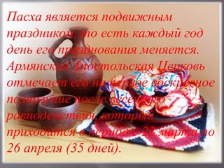 Документ описывает празднование Пасхи в армянской апостольской церкви, которая отмечает его на первое воскресное полнолуние после весеннего равноденствия. Пасхе предшествует страстная неделя, завершающаяся торжественным богослужением, и включает традиции, такие как игра с пасхальными яйцами. Пасха имеет древние языческие корни и символизирует отделение зимы от весны, а в этом году будет отмечаться 27 марта.