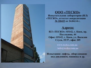 Документ описывает гидравлические испытания сосудов под давлением, проводимые испытательной лабораторией ООО «Теско» в Киеве. В нем приведены детали оборудования для испытаний, таких как максимальное давление и регистрация данных, а также проведенные тесты на различные типы баллонов, включая полимерные, кислородные и стальные. Также представлены коэффициенты запаса прочности и примеры видеозаписей испытаний.