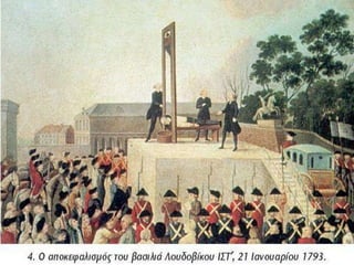 Γ. Η β΄ φάση της γαλλικής επανάστασης (Σεπτ. 1792 – Ιούλ. 1794) Εκλογές 1792 (με καθολική ψηφοφορία): εκλέχτηκε η Συμβατική συνέλευση : κατάργησε τη μοναρχία εγκαθίδρυσε αβασίλευτη δημοκρατία (πρώτη φορά στην Ευρώπη) υιοθέτησε νέο ημερολόγιο βασιλιάς & βασίλισσα καταδικάστηκαν και αποκεφαλίστηκαν (1793)