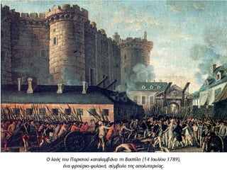 όταν μαθεύτηκαν οικινήσεις του βασιλιά, πολίτες οργισμένοι οπλίστηκαν και κατέλαβαν τις φυλακές της Βαστίλης , όπου γινόταν βασανιστήρια & αποτελούσε μισητό σύμβολο της απολυταρχίας . ( 14 Ιουλ. 1789 Εθνική εορτή Γάλλων).