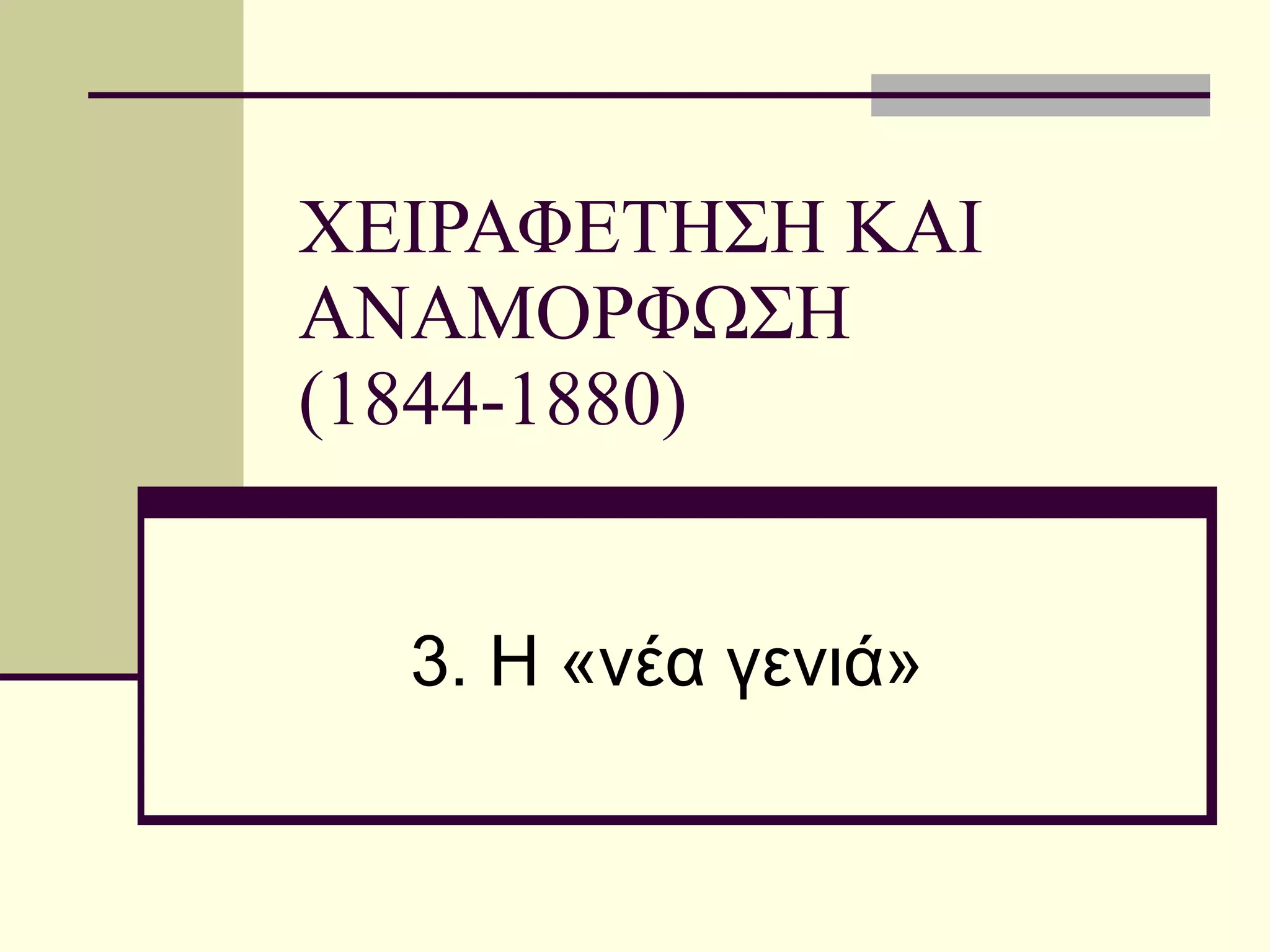 Συνθήκες εμφάνισης της«νέας γενιάς» Δεν έζησαν την Επανάσταση. Βίωνε ραγδαίες αλλαγές στην πολιτική, την οικονομία και την τεχνική ανάπτυξη. Διαμόρφωσε άλλη αντίληψη για τη ζωή (αστικοποίηση, μείωση των αναλφάβητων ανδρών και διάδοση της παιδείας) Αποστασιοποιήθηκε από τις αντιπαραθέσεις της προηγούμενης γενιάς και των κομμάτων που την εξέφραζαν Αυξήθηκαν οι απαιτήσεις , συμμετοχή στα κοινά, εντοπίζο- νταν οι δυσλει- τουργίες του κράτους