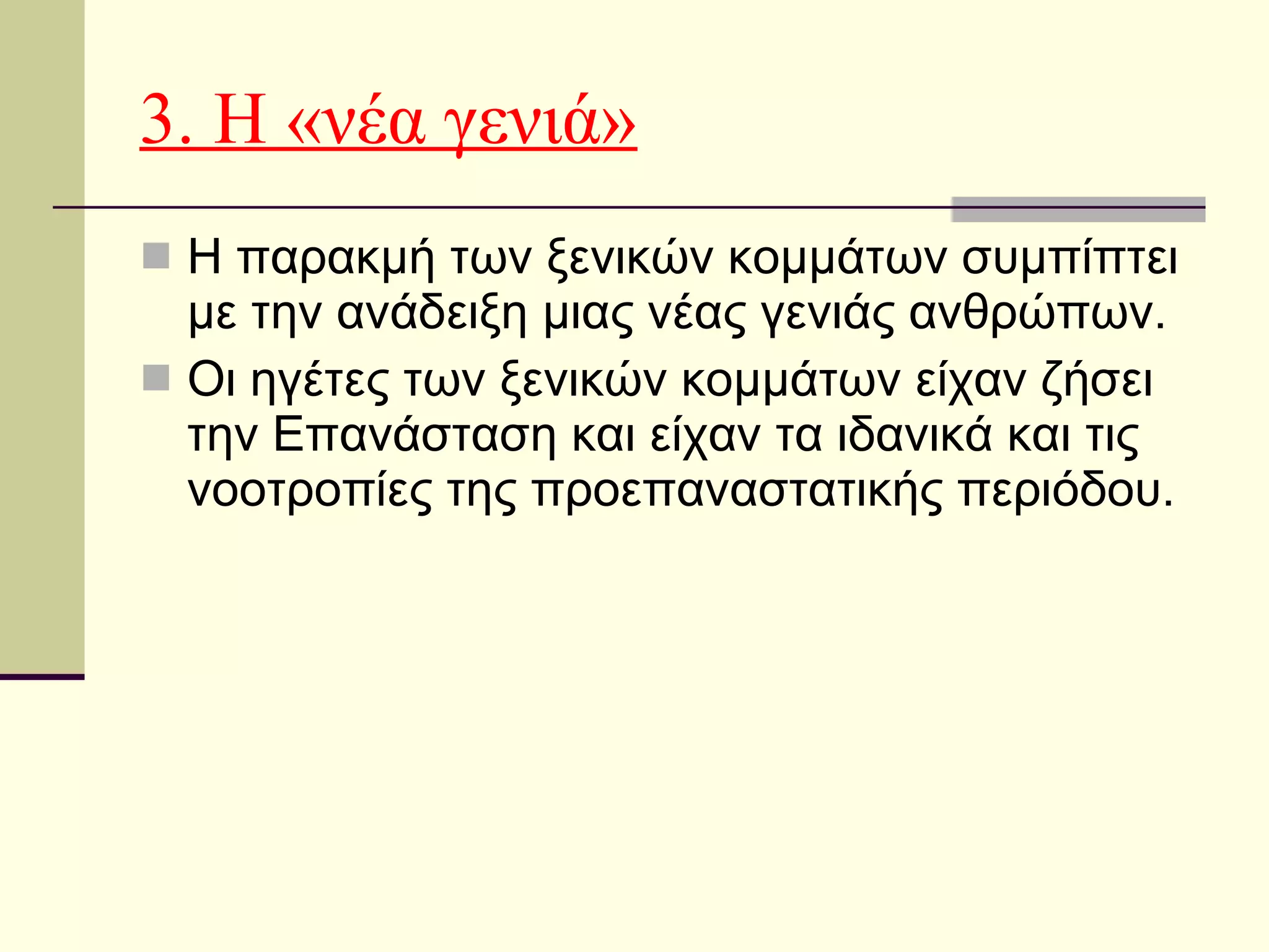3. Η «νέαγενιά» Η παρακμή των ξενικών κομμάτων συμπίπτει με την ανάδειξη μιας νέας γενιάς ανθρώπων. Οι ηγέτες των ξενικών κομμάτων είχαν ζήσει την Επανάσταση και είχαν τα ιδανικά και τις νοοτροπίες της προεπαναστατικής περιόδου.