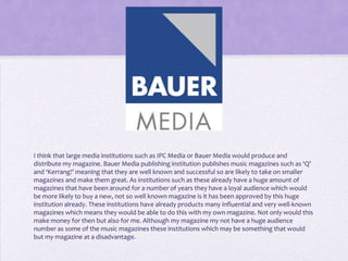 Large media institutions such as IPC Media or Bauer Media would be well-suited to distribute my music magazine because they have a proven track record of successfully publishing magazines like Q and Kerrang that have built a loyal audience. These large institutions could leverage their existing audience and reputation to help promote and grow a new magazine, which would benefit both the institution financially and help ensure the success of my magazine. However, my magazine may face an initial disadvantage in terms of audience size compared to some of the more established music magazines published by these companies.
