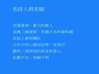 「我童年時候台南是一個田園型的小都市,人口約十三 萬,整個城市裡頭種植的樹木特多,充滿了綠色植物的 這古老城市,日本人常稱呼為『樹林之都』。」