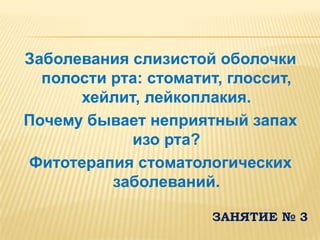 Документ описывает профилактику и лечение заболеваний зубов и полости рта, включая стоматит, глоссит, хейлит и лейкоплакию. Приведены симптомы, возможные причины и методы лечения этих заболеваний, а также причины неприятного запаха изо рта и роль фитотерапии в стоматологии. Подчеркивается важность консультации с врачом для выбора правильного лечения и предотвращения осложнений.
