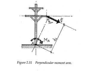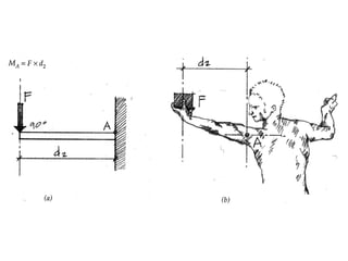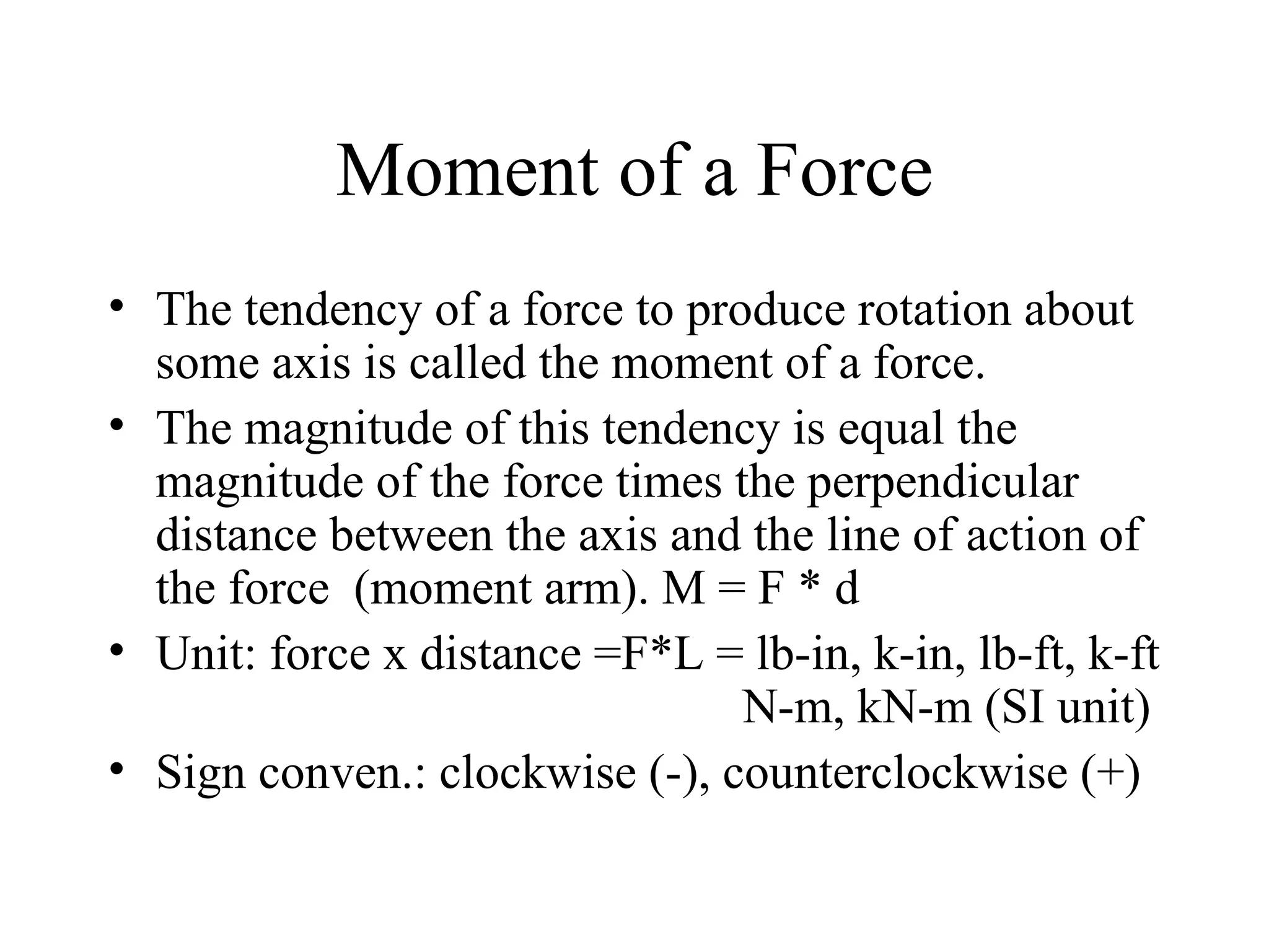 1) The moment of a force is the tendency of a force to produce rotation about an axis, and is equal to the force magnitude times the perpendicular distance to the axis (moment arm).