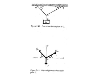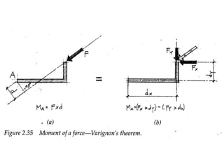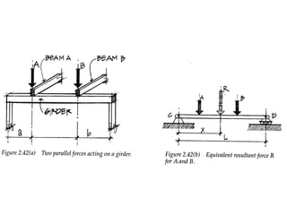 4) Forces can be resolved and moved to different points using the principle that the moment of any added couple must equal the original force times the distance of movement.
