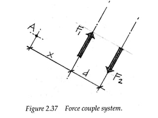 3) Two parallel forces of equal magnitude but opposite direction form a couple, which causes rotation about an axis perpendicular to its plane.