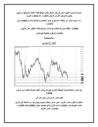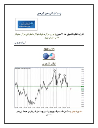 المستند يتناول التحليل الفني لعدة أزواج من العملات (يورو/دولار، باوند/دولار، دولار أسترالي/دولار، دولار كندي/دولار، ودولار ياباني/دولار). يتم استعراض الاتجاهات الهابطة والفرص التصحيحية المحتملة لكل زوج مع تحديد مستويات الدعم والمقاومة المهمة. النص يقدم توقعات سوقية لتحركات الأسعار استناداً إلى أنماط فنية وتحليل فيبوناتشي للمساعدة في اتخاذ قرارات التداول.