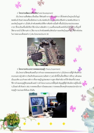 เป็ น โครงงานเพื่อพัฒนาเรื่ องมือมาใช้ ช่วยสร้ างงานประยุกต์ตาง ๆ ซึงโดยส่วนใหญ่จะเป็ นในรูป ่ ่ ซอฟต์แวร์ ตัวอย่างของเครื่ องมือช่วยงาน เช่น ซอฟต์แวร์ วาดรูป ซอฟต์แวร์ พิมพ์งาน ซอฟต์แวร์ ช่วยการ มองวัตถุในมุมต่าง ๆ เป็ นต้ น สาหรับซอฟต์แวร์ เพื่อการพิมพ์งานนันสร้ างขึ ้นเป็ นโปรแกรมประมวลผล ้ ภาษา ซึงจะเป็ นเครื่ องมือให้ เราใช้ งานในงานพิมพ์ตาง ๆ บนเครื่ องคอมพิวเตอร์ เป็ นไปได้ โดยง่าย ซึงรูปที่ ่ ่ ่ ได้ สามารถนาไปใช้ งานต่าง ๆ ได้ มากมาย สาหรับซอฟต์แวร์ ชวยในการมองวัตถุในมุมต่าง ๆ ใช้ สาหรับช่วย ่ ในการออกแบบสิ่งของต่าง ๆ เช่น โปรแกรมประเภท 3D 3. โครงงานประเภทการทดลองทฤษฎี (Theory Experiment) เป็ น โครงงานใช้ คอมพิวเตอร์ ในการจาองการทดลองของสาขาต่าง ๆ เป็ นโครงงานที่ผ้ ทาต้ องศึกษา ู รวบรวมความรู้ หลักการ ข้ อเท็จจริงและแนวความคิดต่าง ๆ อย่างลึกซึ ้งในเรื่ องที่ต้องการศึกษา แล้ วเสนอ เป็ นแนวคิด แบบจาลอง หลักการ ซึงอาจอยูในรูปของสมการ สูตร หรื อคาอธิบายก็ได้ พร้ อมทังนาเสนอ ่ ่ ้ วิธีการจาลองทฤษฎีด้วยคอมพิวเตอร์ การทาโครงงานประเภทนี ้มีจดสาคัญอยูที่ผ้ ทาต้ องมีความรู้เรื่ องนัน ุ ่ ู ้ ๆ เป็ นอย่างดี ตัวอย่าง เช่น การทดลองเรื่ องการไหลของเหลว การทดลองเรื่ องพฤติกรรมของปลาอโรวาน่า ทฤษฎีการแบ่งแยกดีเอ็นเอ เป็ นต้ น