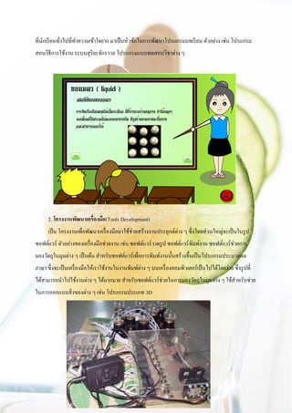 นหัวข้อในการพัฒนาโปรแกรมบทเรี ยน ตัวอย่าง เช่น โปรแกรม ั ่ ํ สอนวิธีการใช้งาน ระบบสุ ริยะจักรวาล โปรแกรมแบบทดสอบวิชาต่าง ๆ 2. โครงงานพฒนาเครื่องมือ(Tools Development) ั เป็ น โครงงานเพื่อพัฒนาเครื่ องมือมาใช้ช่วยสร้างงานประยุกต์ต่าง ๆ ซึ่ งโดยส่ วนใหญ่จะเป็ นในรู ป ซอฟตแวร์ ตวอยางของเครื่องมือช่วยงาน เช่น ซอฟตแวร์วาดรูป ซอฟตแวร์พิมพงาน ซอฟตแวร์ช่วยการ ์ ั ่ ์ ์ ์ ์ มองวัตถุในมุมต่าง ๆ เป็ นต้น สําหรับซอฟต์แวร์ เพื่อการพิมพ์งานนั้นสร้างขึ้นเป็ นโปรแกรมประมวลผล ภาษา ซึ่ งจะเป็ นเครื่ องมือให้เราใช้งานในงานพิมพ์ต่าง ๆ บนเครื่ องคอมพิวเตอร์ เป็ นไปได้โดยง่าย ซึ่ งรู ปที่ ได้สามารถนําไปใช้งานต่าง ๆ ได้มากมาย สําหรับซอฟต์แวร์ ช่วยในการมองวัตถุในมุมต่าง ๆ ใช้สาหรับช่วย ํ ในการออกแบบสิ่ งของต่าง ๆ เช่น โปรแกรมประเภท 3D