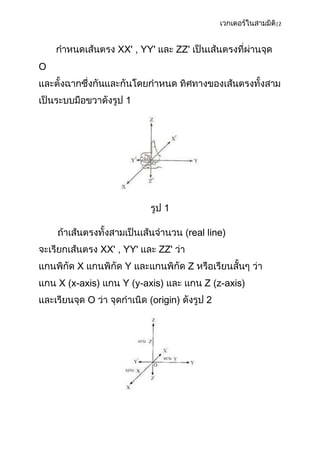 3. Various vector operations are described such as addition, scalar multiplication, and dot and cross products. Properties of position vectors, unit vectors and applications to geometry are also covered.
