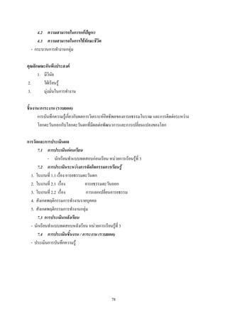 4.3 ความสามารถในการใช้ทักษะชีวิต - กระบวนการท้างานกลุ่ม คุณลักษณะอันพึงประสงค์ 1. มีวินัย 2. ใฝ่เรียนรู้ 3. มุ่งมั่นในการท้างาน ชิ้นงาน/ภาระงาน (รวบยอด) การบันทึกความรู้เกี่ยวกับผลการวิเคราะห์อิทธิพลของอารยธรรมโบราณ และการติดต่อระหว่าง โลกตะวันออกกับโลกตะวันตกที่มีผลต่อพัฒนาการและการเปลี่ยนแปลงของโลก การวัดและการประเมินผล 7.1 การประเมินก่อนเรียน - นักเรียนท้าแบบทดสอบก่อนเรียน หน่วยการเรียนรู้ที่ 3 7.2 การประเมินระหว่างการจัดกิจกรรมการเรียนรู้ 1. ใบงานที่ 1.1 เรื่อง อารยธรรมตะวันตก 2. ใบงานที่ 2.1 เรื่อง อารยธรรมตะวันออก 3. ใบงานที่ 2.2 เรื่อง การแลกเปลี่ยนอารยธรรม 4. สังเกตพฤติกรรมการท้างานรายบุคคล 5. สังเกตพฤติกรรมการท้างานกลุ่ม 7.3 การประเมินหลังเรียน - นักเรียนท้าแบบทดสอบหลังเรียน หน่วยการเรียนรู้ที่ 3 7.4 การประเมินชิ้นงาน / ภาระงาน (รวบยอด) - ประเมินการบันทึกความรู้ 78
