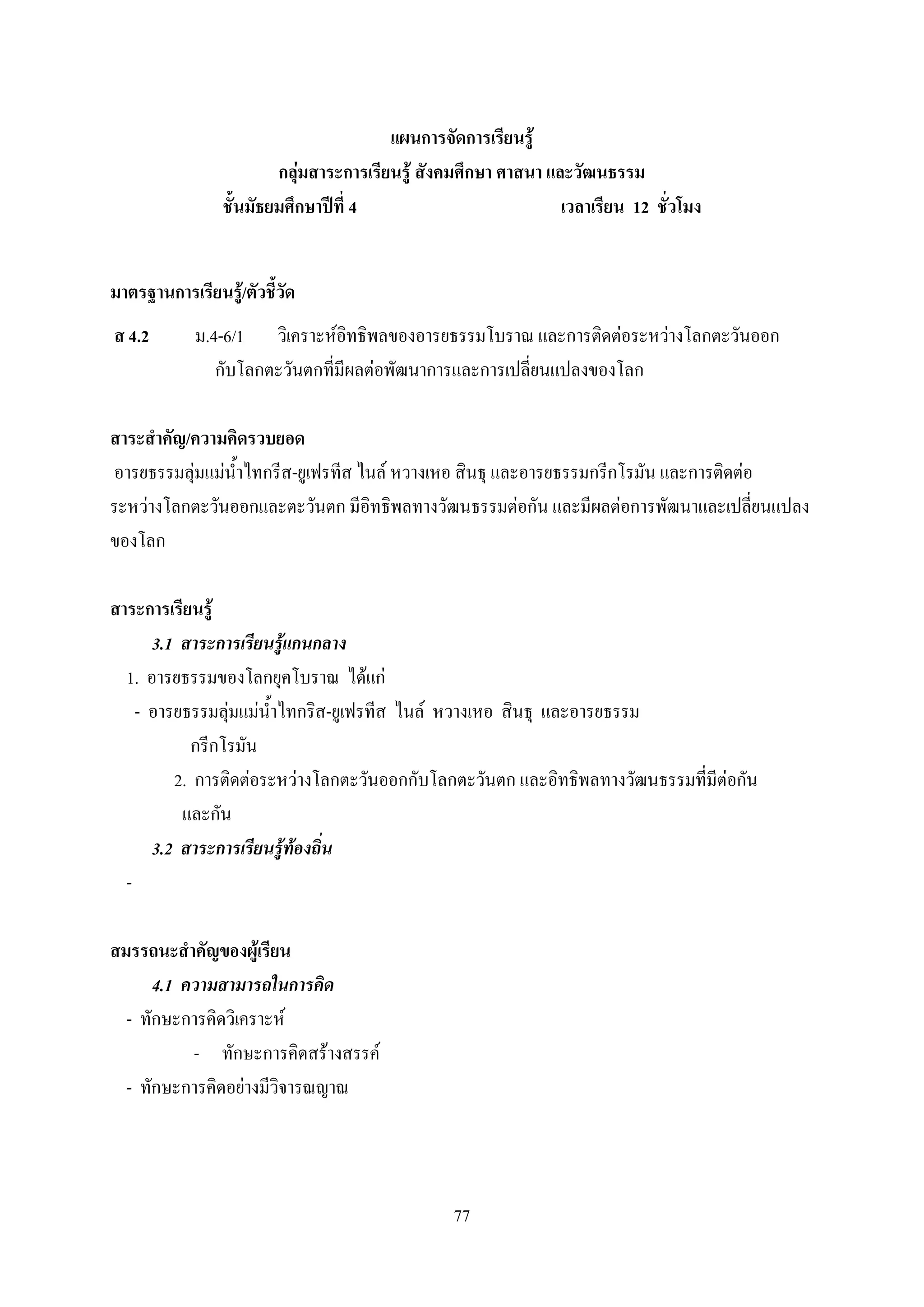 กลุ่มสาระการเรียนรู้ สังคมศึกษา ศาสนา และวัฒนธรรม ชั้นมัธยมศึกษาปีที่ 4 เวลาเรียน 12 ชั่วโมง มาตรฐานการเรียนรู้/ตัวชี้วัด ส 4.2 ม.4-6/1 วิเคราะห์อิทธิพลของอารยธรรมโบราณ และการติดต่อระหว่างโลกตะวันออก กับโลกตะวันตกที่มีผลต่อพัฒนาการและการเปลี่ยนแปลงของโลก สาระสาคัญ/ความคิดรวบยอด อารยธรรมลุ่มแม่น้าไทกรีส-ยูเฟรทีส ไนล์ หวางเหอ สินธุ และอารยธรรมกรีกโรมัน และการติดต่อ ระหว่างโลกตะวันออกและตะวันตก มีอิทธิพลทางวัฒนธรรมต่อกัน และมีผลต่อการพัฒนาและเปลี่ยนแปลง ของโลก สาระการเรียนรู้ 3.1 สาระการเรียนรู้แกนกลาง 1. อารยธรรมของโลกยุคโบราณ ได้แก่ - อารยธรรมลุ่มแม่น้าไทกริส-ยูเฟรทีส ไนล์ หวางเหอ สินธุ และอารยธรรม กรีกโรมัน 2. การติดต่อระหว่างโลกตะวันออกกับโลกตะวันตก และอิทธิพลทางวัฒนธรรมที่มีต่อกัน และกัน 3.2 สาระการเรียนรู้ท้องถิ่น - สมรรถนะสาคัญของผู้เรียน 4.1 ความสามารถในการคิด - ทักษะการคิดวิเคราะห์ - ทักษะการคิดสร้างสรรค์ - ทักษะการคิดอย่างมีวิจารณญาณ 77