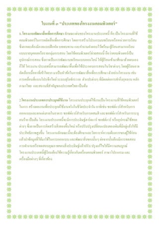 " 1. โครงงานพัฒนาสื อเพือการศึกษา ลักษณะเด่นของโครงงานประเภทนี คือ เป็ นโครงงานทีใช้ คอมพิวเตอร์ในการผลิตสื อเพือการศึกษา โดยการสร้างโปรแกรมบทเรี ยนหรื อหน่วยการเรี ยน ซึงอาจจะต้องมีภาคแบบฝึ กหัด บททบทวน และคําถามคําตอบไว้พร้อม ผูเ้ รี ยนสามารถเรี ยน แบบรายบุคคลหรื อรายกลุ่มการสอน โดยใช้คอมพิวเตอร์ช่วยสอนนี ถือว่าคอมพิวเตอร์เป็ น อุปกรณ์การสอน ซึงอาจเป็ นการพัฒนาบทเรี ยนแบบออนไลน์ ให้ผเู ้ รี ยนเข้ามาศึกษาด้วยตนเอง ก็ได้ โครงงาน ประเภทนีสามารถพัฒนาขึนเพือใช้ประกอบการสอนในวิชาต่างๆ โดยผูเ้ รี ยนอาจ คัดเลือกเนือหาทีเข้าใจยาก มาเป็ นหัวข้อในการพัฒนาสื อเพือการศึกษา ตัวอย่างโครงงาน เช่น การเคลือนทีแบบโปรเจ็กไตล์ ระบบสุ ริยจักรวาล ตัวแปรต่างๆ ทีมีผลต่อการชํากิงกุหลาบ หลัก ภาษาไทย และสถานทีสําคัญของประเทศไทย เป็ นต้น 2.โครงงานประเภทการประยุกต์ ใช้ งาน โครงงานประยุกต์ใช้งานเป็ นโครงงานทีใช้คอมพิวเตอร์ ในการ สร้างผลงานเพือประยุกต์ใช้งานจริ งในชีวตประจําวัน อาทิเช่น ซอฟต์แวร์สาหรับการ ิ ํ ออกแบบและตกแต่งภายในอาคาร ซอฟต์แวร์สาหรับการผสมสี และซอฟต์แวร์สาหรับการระบุ ํ ํ คนร้าย เป็ นต้น โครงงานประเภทนีจะมีการประดิษฐ์ฮาร์ดแวร์ ซอฟต์แวร์ หรื ออุปกรณ์ใช้สอย ่ ต่างๆ ซึงอาจเป็ นการคิดสร้างสิ งของขึนใหม่ หรื อปรับปรุ งเปลียนแปลงของเดิมทีมีอยูแล้วให้มี ประสิ ทธิภาพสู งขึน โครงงานลักษณะนีจะต้องศึกษาและวิเคราะห์ความต้องการของผูใช้ก่อน ้ แล้วนําข้อมูลทีได้มาใช้ในการออกแบบ และพัฒนาสิ งของนันๆ ต่อจากนันต้องมีการทดสอบ การทํางานหรื อทดสอบคุณภาพของสิ งประดิษฐ์แล้วปรับ ปรุ งแก้ไขให้มีความสมบูรณ์ โครงงานประเภทนีผูเ้ รี ยนต้องใช้ความรู ้เกียวกับเครื องคอมพิวเตอร์ ภาษาโปรแกรม และ เครื องมือต่างๆ ทีเกียวข้อง