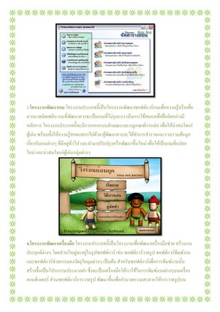 ้หรื อเพือ ความ เพลิดเพลิน เกมทีพัฒนาควรจะเป็ นเกมทีไม่รุนแรง เน้นการใช้สมองเพือฝึ กคิดอย่างมี หลักการ โครงงานประเภทนีจะมีการออกแบบลักษณะและกฎเกณฑ์การเล่น เพือให้น่าสนใจแก่ ผูเ้ ล่น พร้อมทังให้ความรู ้สอดแทรกไปด้วย ผูพฒนาควรจะได้ทาการสํารวจและรวบรวมข้อมูล ้ ั ํ ่ ั เกียวกับเกมต่างๆ ทีมีอยูทวไป และนํามาปรับปรุ งหรื อพัฒนาขึนใหม่ เพือให้เป็ นเกมทีแปลก ใหม่ และน่าสนใจแก่ผเู ้ ล่นกลุ่มต่างๆ 4.โครงงานพัฒนาเครืองมือ โครงงานประเภทนีเป็ นโครงงานเพือพัฒนาเครื องมือช่วย สร้างงาน ประยุกต์ต่างๆ โดยส่ วนใหญ่จะอยูในรู ปซอฟต์แวร์ เช่น ซอฟต์แวร์วาดรู ป ซอฟต์แวร์พิมพ์งาน ่ และซอฟต์แวร์ช่วยการมองวัตถุในมุมต่างๆ เป็ นต้น สําหรับซอฟต์แวร์เพือการพิมพ์งานนัน สร้างขึนเป็ นโปรแกรมประมวลคํา ซึงจะเป็ นเครื องมือให้เราใช้ในการพิมพ์งานต่างๆบนเครื อง คอมพิวเตอร์ ส่ วนซอฟต์แวร์การวาดรู ป พัฒนาขึนเพืออํานวยความสะดวกให้การวาดรู ปบน