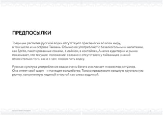 Документ описывает процесс ребрендинга русской водки «Янков» для рынка Тайваня, подчеркивая отсутствие культуры употребления водки в стране и необходимость разработки стратегии позиционирования. Исследование рынка показывает положительные экономические прогнозы и низкую конкуренцию со стороны местных производителей, что создает возможность для успешного входа на рынок. Целевая аудитория включает мужчин в возрасте 35-50 лет с высоким доходом, которые ценят качество и статус в потреблении алкогольных напитков.