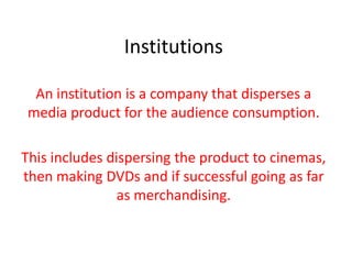 StudioCanal UK would be the media institution that would distribute the horror movie, as they have previously distributed a similar film called "Attack the Block" set in a London estate. StudioCanal UK would likely be interested in distributing the film and have sufficient financial backing. They would also be a suitable institution for reaching a British audience.