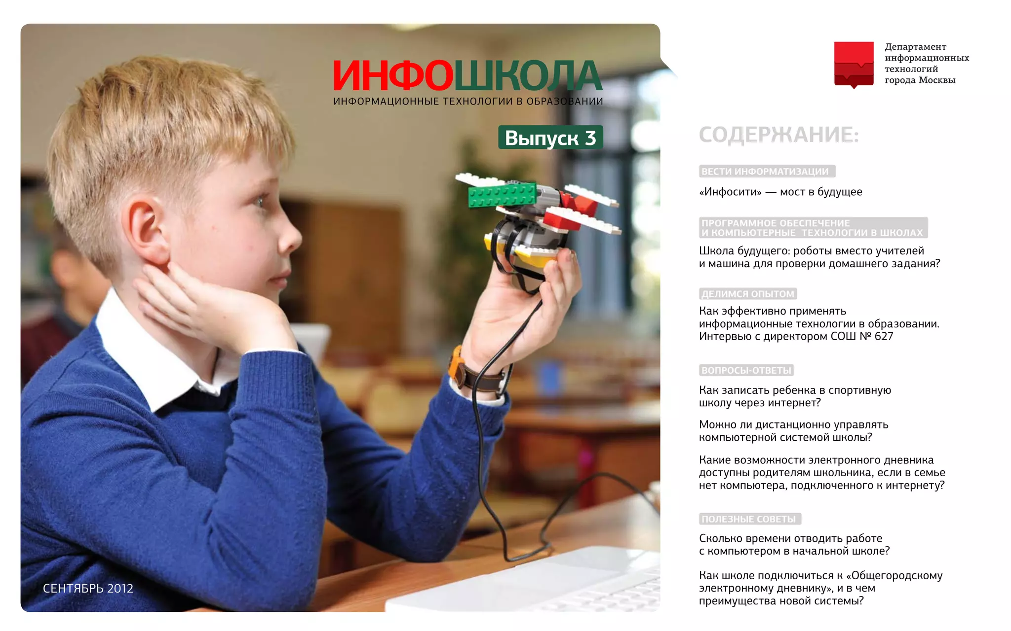 В третьем выпуске 'инфошколы' рассматривается применение информационных технологий в образовании и концепция 'школы будущего', где учителя и дети взаимодействуют через современные технологии. Документ содержит примеры внедрения электронных систем в учебный процесс, включая интервью с директорами школ и мнения родителей о будущем образования и роли технологий. Также описывается фестиваль 'инфосити', который продемонстрировал новейшие достижения в области образовательных технологий.