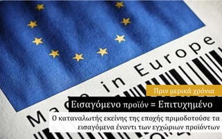 #3 Δεν έχουν περάσει πολλά χρόνια από την εποχή που σχεδόν από μόνο του το γεγονός ότι ένα προϊόν προερχόταν από μια χώρα του εξωτερικού (κατά κύριο λόγο Δ. Ευρώπη τότε) αποτελούσε εχέγγυο επιτυχίας του στην ελληνική αγορά. Ο Έλληνας καταναλωτής πριμοδοτούσε τα εισαγόμενα προϊόντα και δημιούργησε ένα νέο καταναλωτικό πρότυπο.