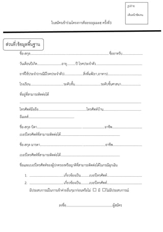 เห็นหน้ าชัดเจน ใบสมัครเข้าร่วมโครงการค็อยรออุมมะฮฺ ครั้งที่ 3 ส่วนที่1ข้ อมูลพื ้นฐาน ชื่อ-สกุล................................................................................................... ชื่ออาหรับ.......................... วันเดือนปีเกิด...............................อายุ...........ปี โรคประจาตัว. ......................................................... ยาที่ใช้ประจา(กรณีมีโรคประจาตัว)........................สิ่งที่แพ้(ยา,อาหาร)........................................... โรงเรียน..........................................ระดับชั้น.................................ระดับชั้นศาสนา......................... ที่อยู่ที่สามารถติดต่อได้ .......................................................................................................................................................... โทรศัพท์มือถือ.............................................................โทรศัพท์บ้าน................................................ อีเมลส์.......................................................... ชื่อ-สกุล บิดา.....................................................................................อาชีพ...................................... เบอร์โทรศัพท์ที่สามารถติดต่อได้........................................................................... ชื่อ-สกุล มารดา..................................................................................อาชีพ..................................... เบอร์โทรศัพท์ที่สามารถติดต่อได้........................................................................... ชื่อและเบอร์โทรศัพท์ของผู้ปกครองหรือญาติที่สามารถติดต่อได้ในกรณีฉุกเฉิน 1. ...........................................เกี่ยวข้องเป็น...........เบอร์โทรศัพท์............................................ 2. ...........................................เกี่ยวข้องเป็น...........เบอร์โทรศัพท์............................................ มีประสบการณ์ในการเข้าค่ายอื่นๆมาก่อนหรือไม่ มี ไม่มีประสบการณ์ ลงชือ...........................................................ผู้สมัคร ่