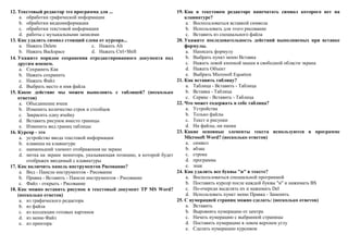Документ содержит контрольную работу, посвященную основным функциям текстового редактора, включая команды копирования, вырезания и вставки текста, а также задает вопросы о параметрах страницы и работе с таблицами. В нем рассматриваются различные аспекты работы с текстом, включая шрифты, выравнивание, вставку символов и удаление текста. Вопросы нацелены на проверку знаний и умений пользователей относительно использования текстового редактора.