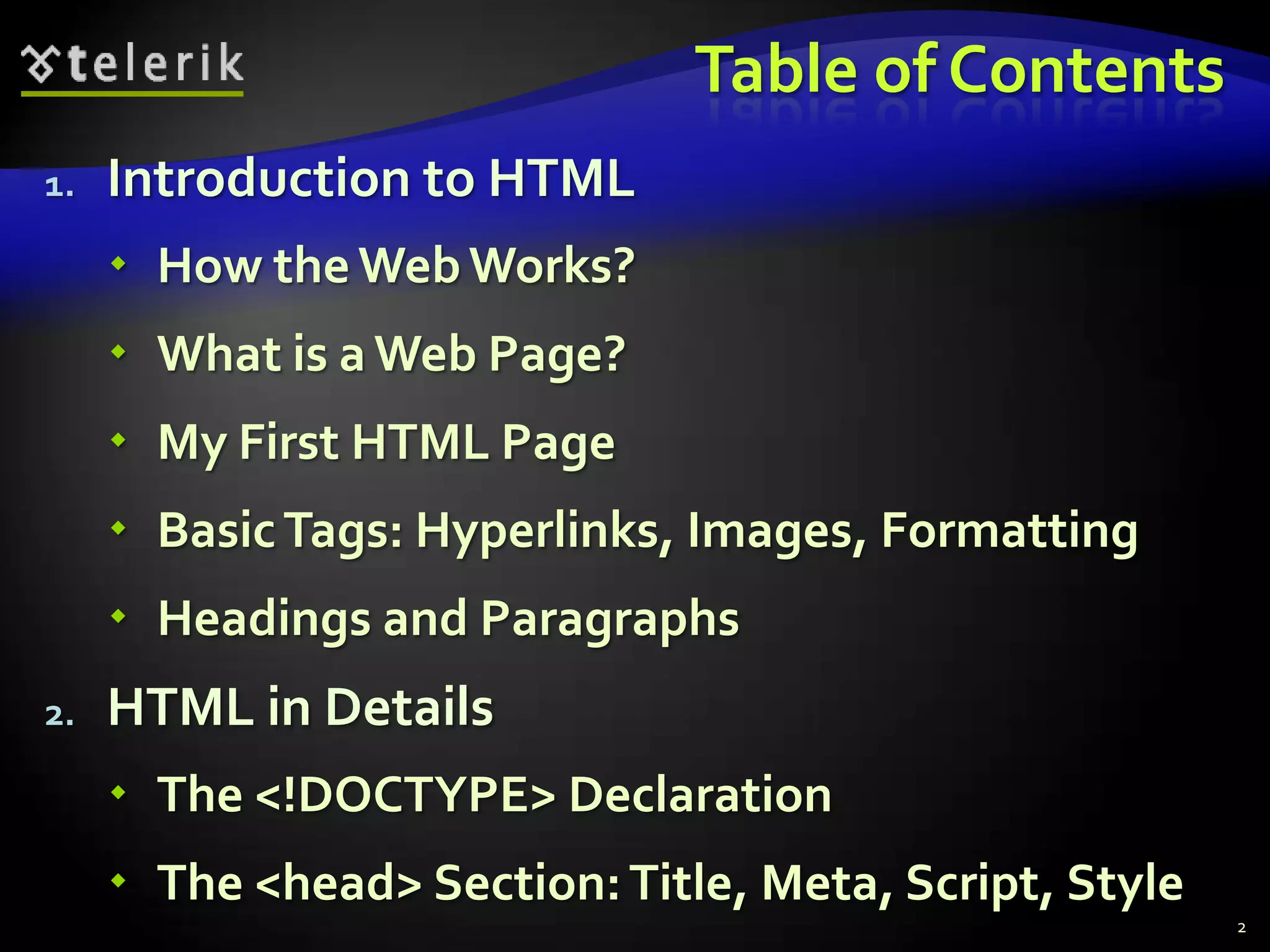 The document provides an introduction to HTML basics including the structure of an HTML document and common tags. It discusses the <head> and <body> sections, with the <head> containing metadata like the <title> and optional <meta>, <script>, and <style> tags. The <body> contains the visible page content and supports text formatting, hyperlinks, images, lists, and divisions/spans.
