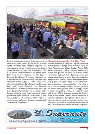 Il notiziario dell'associazione Siena Rugby Club 2000 descrive le recenti attività e risultati delle squadre giovanili, evidenziando le vittorie delle under 14 e le prestazioni positive degli under 10 e under 8. Il documento annuncia anche un allenamento congiunto con il Rovigo Rugby, evidenziando l'importanza di questa esperienza per i giovani atleti. Inoltre, si discute della popolarità della nazionale italiana di rugby e dell'attrattiva che esercita sui tifosi nonostante le difficoltà nel torneo Sei Nazioni.