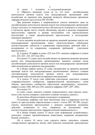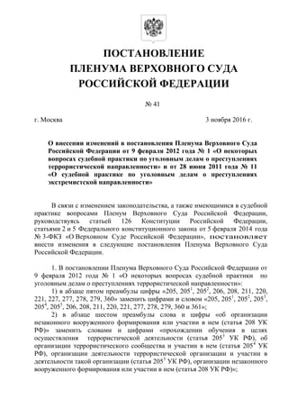 Постановление пленума Верховного суда Российской Федерации от 3 ноября 2016 года вносит изменения в существующие постановления, касающиеся судебной практики по уголовным делам террористической и экстремистской направленности. Основные изменения касаются уточнения определений термина «террористическое сообщество» и формулировок уголовных статей, связанных с террористической деятельностью. Документ также подчеркивает важность анализа намерений обвиняемых и обстоятельств преступления при вынесении решений судами.