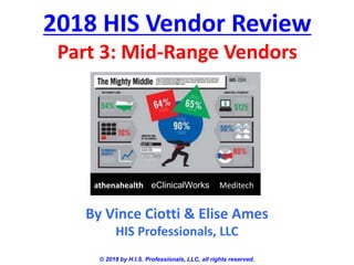 This document provides an overview and analysis of 3 mid-sized healthcare information system (HIS) vendors: athenahealth, eClinicalWorks, and Meditech. It discusses their annual revenues, product lines, client bases by hospital size, recent acquisitions and developments, and future prospects. Athenahealth has over $1 billion in annual revenue and offers both physician practice and hospital information systems. eClinicalWorks generates $490 million annually from its electronic health records for small physician practices but faced legal issues in 2017. Meditech has a long history and three distinct HIS products serving over 1,000 hospitals, and its prospects are positive with a new physician system and cloud offerings.