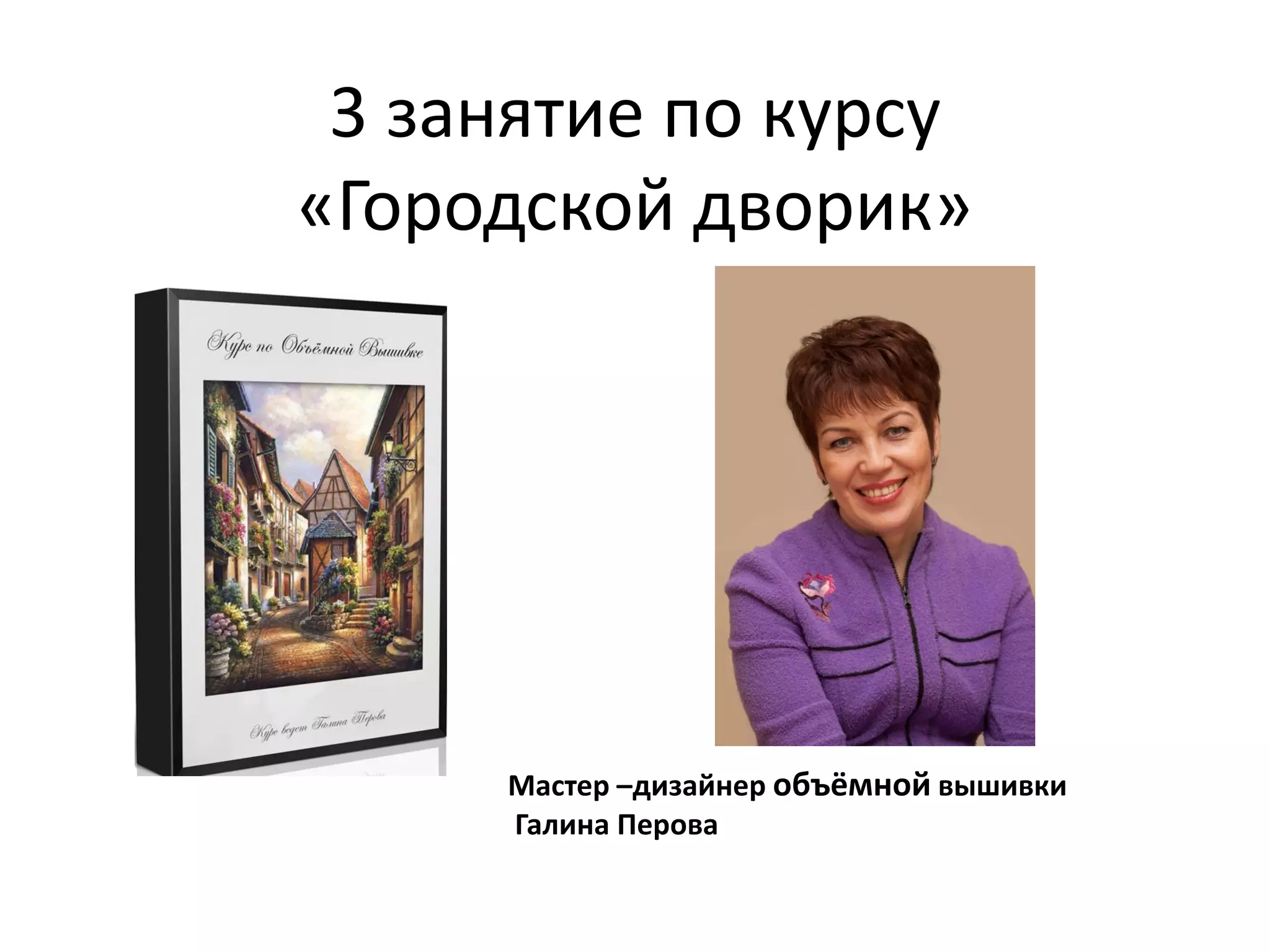 Документ описывает третье занятие курса 'Городской дворик', проводимого мастер-дизайнером Галиной Перовой и участниками из России и Румынии. Задания включают выделение таких элементов, как ставни, двери и цветы на дальнем плане. Этот курс направлен на развитие навыков в объёмной вышивке.